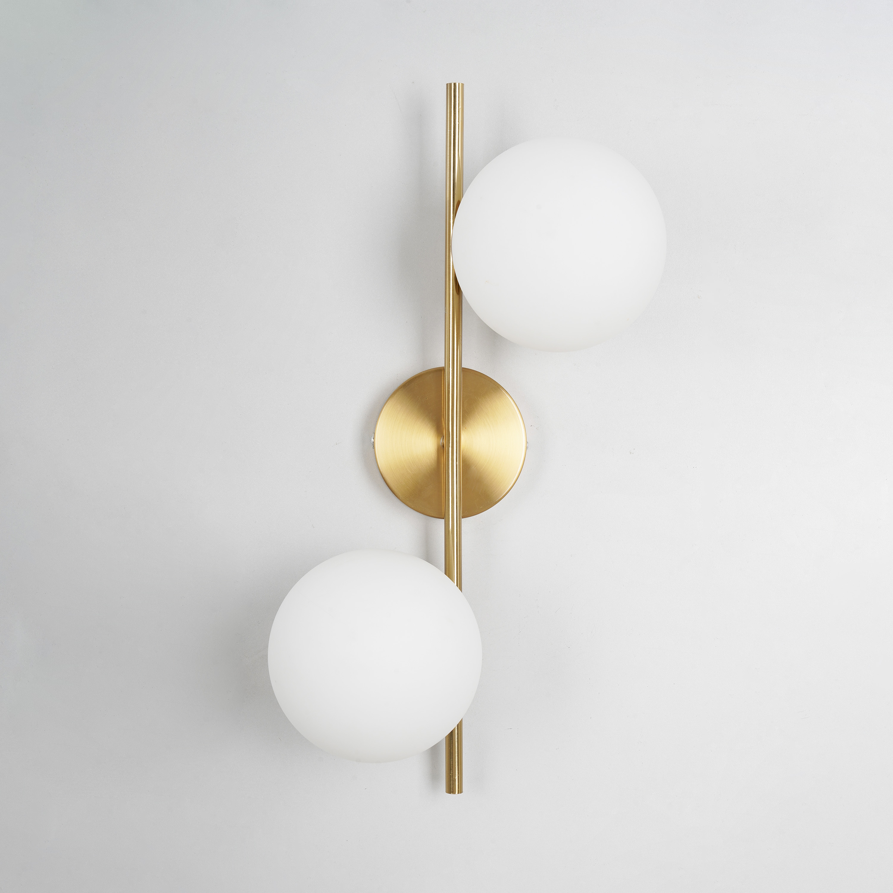 Applique da parete in metallo dorato con due sfere in vetro bianco satinato V712