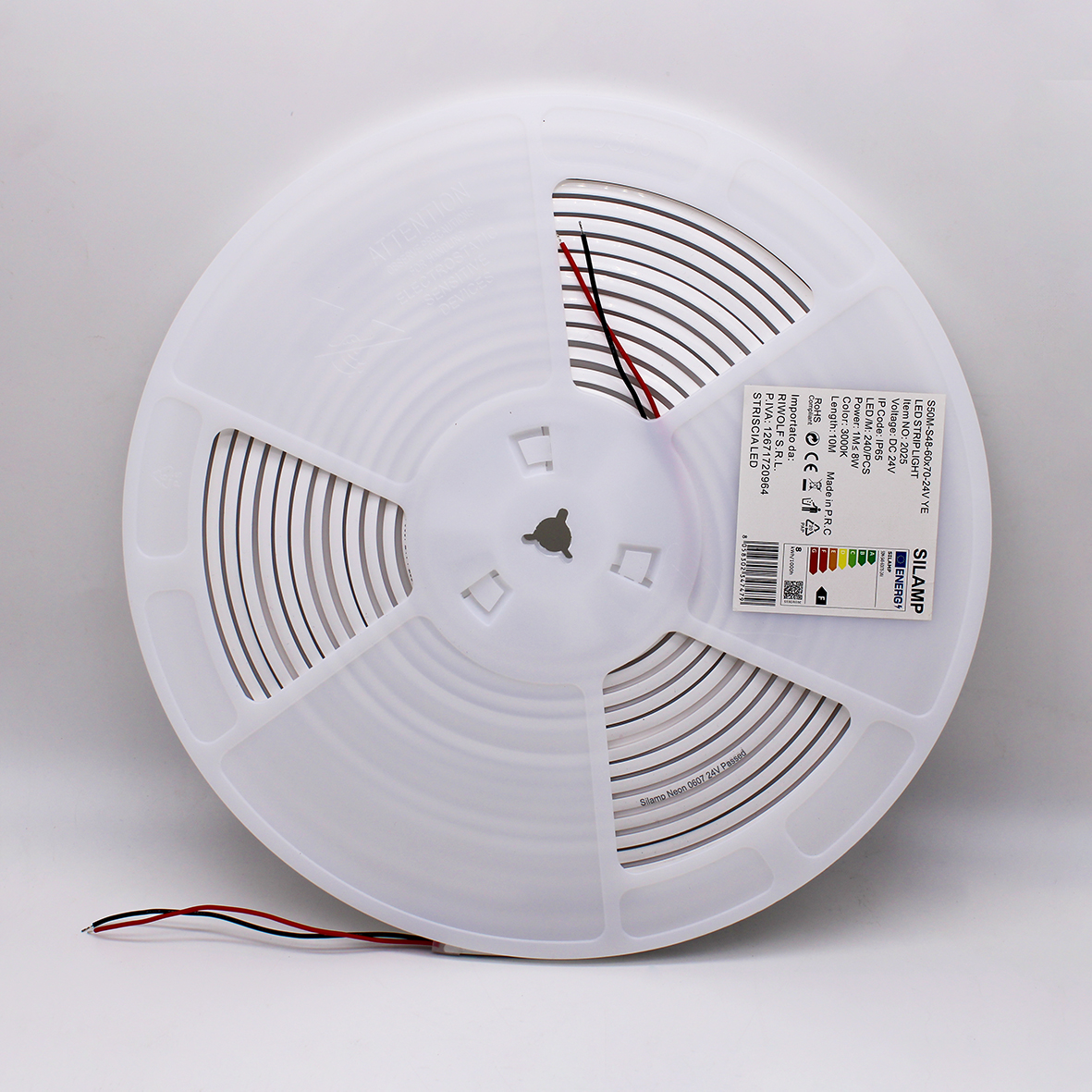 Bobina 10 metri di striscia LED a bassa tensione 24V offre una luminosità di 8W al metro, con un flusso luminoso di circa 720 Lumens, è la soluziona perfetta per una luce secondaria, decorativa o di segnalazione in zone di passaggio.
