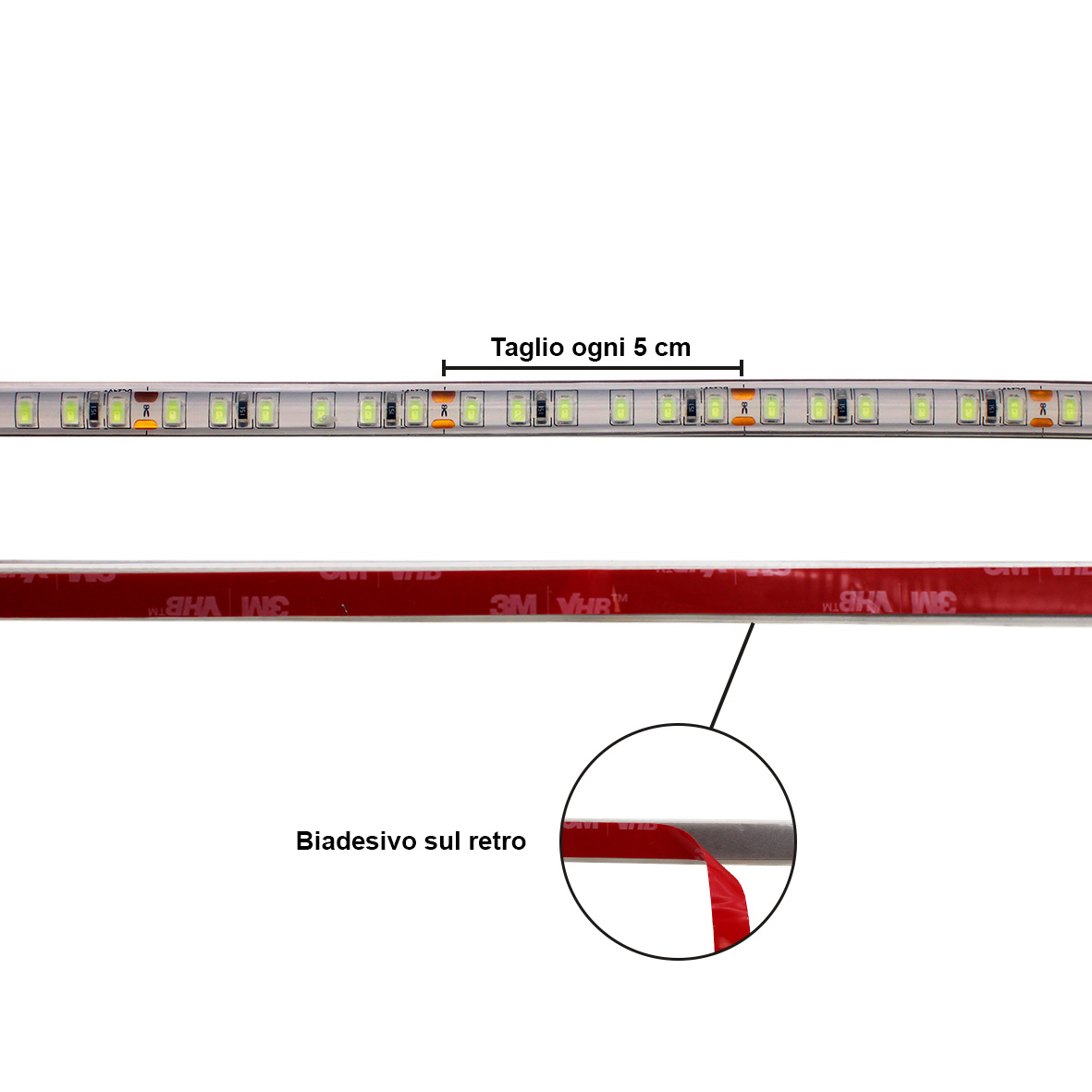 Questa striscia è ADESIVA, può essere tagliata ad ogni 5 cm, nei punti adibiti al taglio, ossia dove troverete una linea nera nella parte dietro della striscia led.