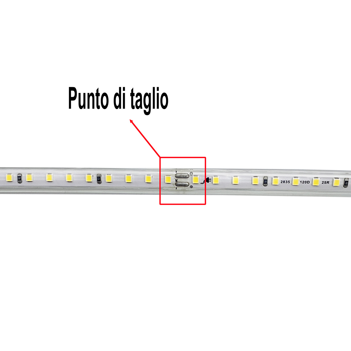 Questa striscia LED 220V può essere tagliata ad ogni 100 cm, negli spazi adibiti al taglio, ossia dove troverete le interruzioni della striscia led.