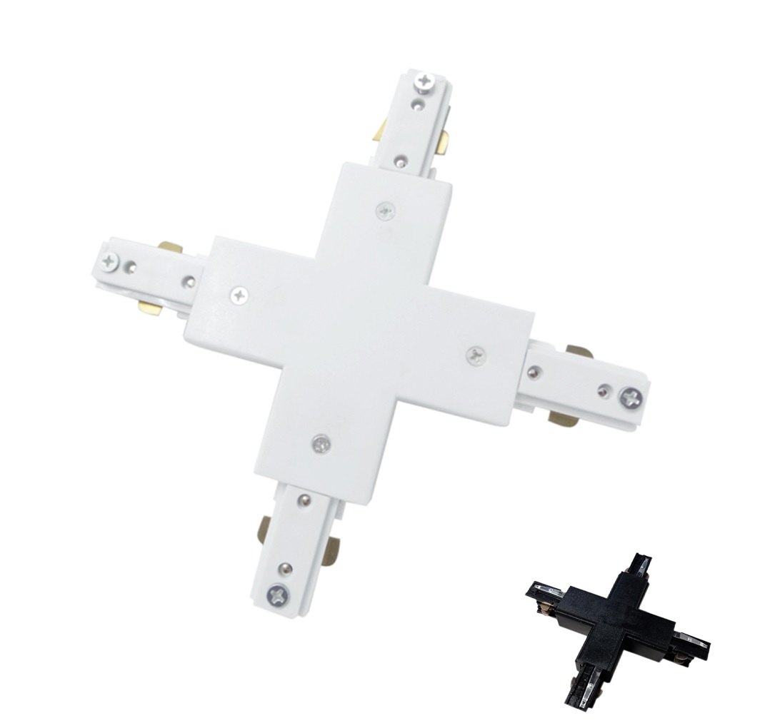 Il Connettore BIANCO o NERO Trifase angolare A24 permette di unire a X fino a quattro binari TRIFASE, per quattro differenti direzioni (su, giù, destra e sinistra).