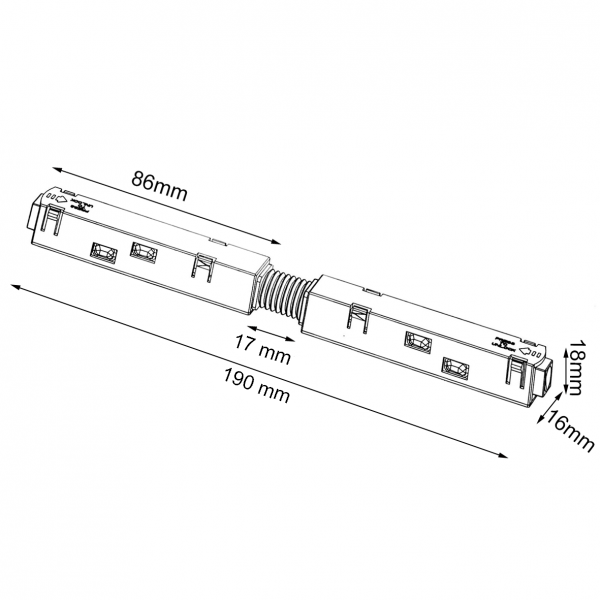 Questa giunzione snodabile è realizzata appositamente per collegare due binari magnetici, infatti mediante questo accessorio sarà possiible portare la tensione di corrente 48 volt DC da un binario all'altro.