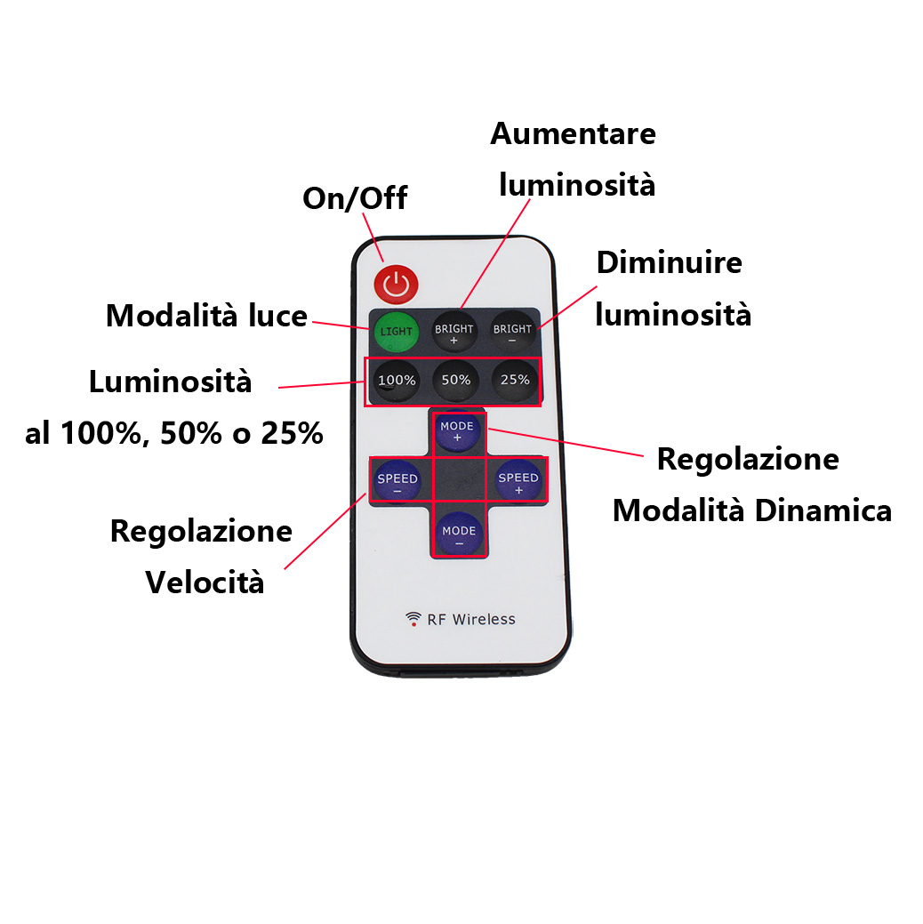 Il telecomando è un trasmettitore compatto a 9 tasti che utilizza la tecnologia RF Wireless. Questa caratteristica offre il vantaggio di controllare l'illuminazione a distanza, senza la necessità di puntare direttamente il controller, a differenza dei sistemi a infrarossi (IR).