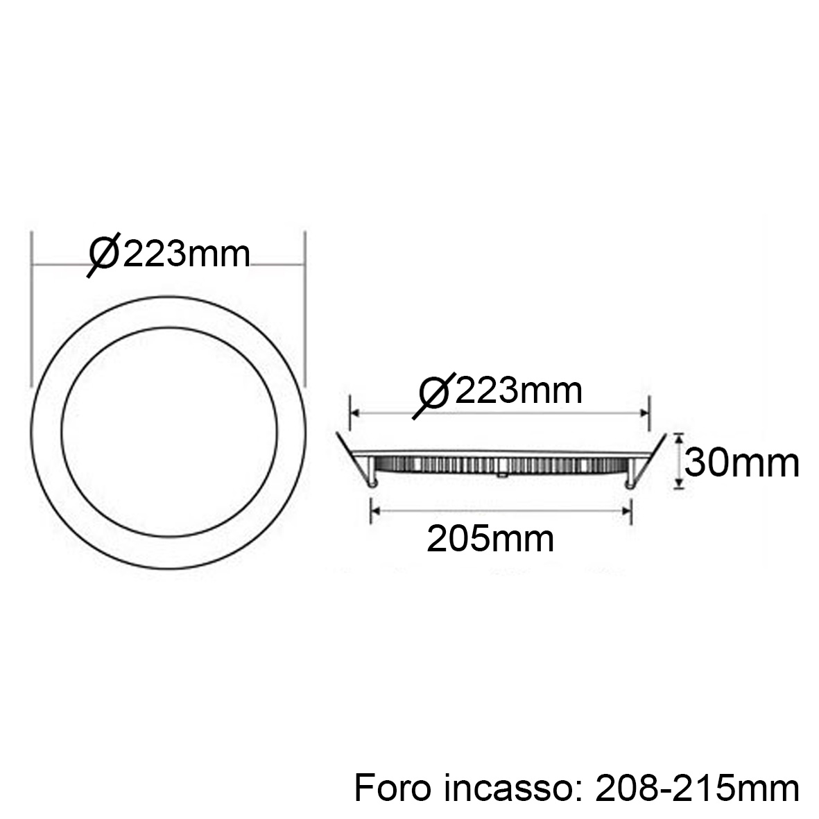 •   Dimensioni: Diametro: 223mm, Altezza: 30mm, Foro incasso: 208-215mm