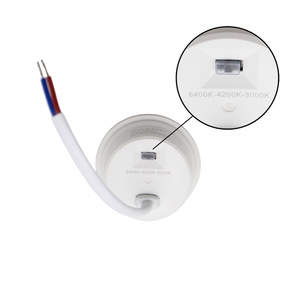 Lo switch integrato consente la selezione della temperatura colore tra 3000K, 4200K e 6400K, adattandosi a diverse esigenze luminose con un unico prodotto.