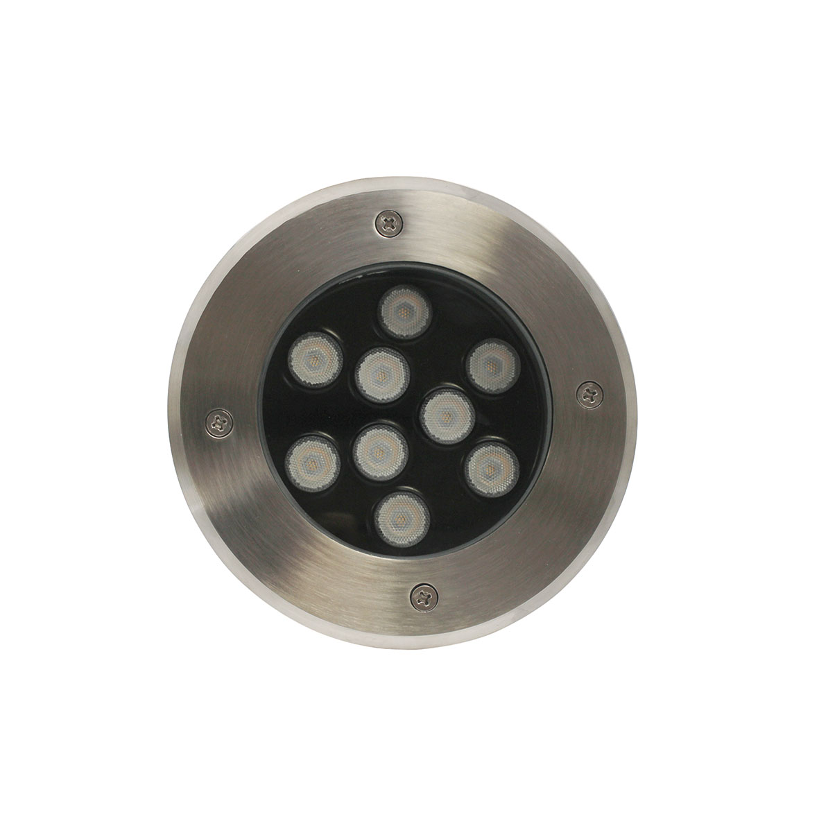 Faretto LED 9W 220V 9x1w calpestabile, carrabile ideale per installazioni ad incasso. Può essere utilizzato come segnapasso per ambienti interni e/o esterni come giardini, vialetti, fontane, piscine.