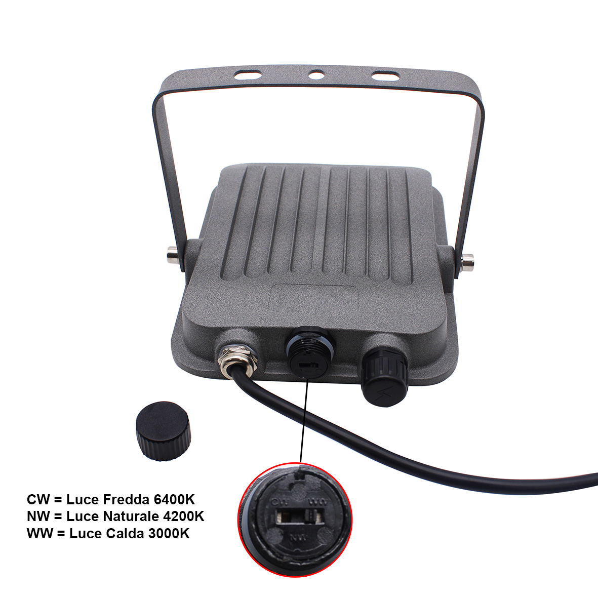 Il faretto nella parte inferiore possiede uno SWITCH o meglio un pulsante con la quale è possibile scegliere la tonalità che si preferisce: Luce calda 3000k (WW) – Luce Naturale 4200k (NW) – Luce Fredda 6400k (CW).