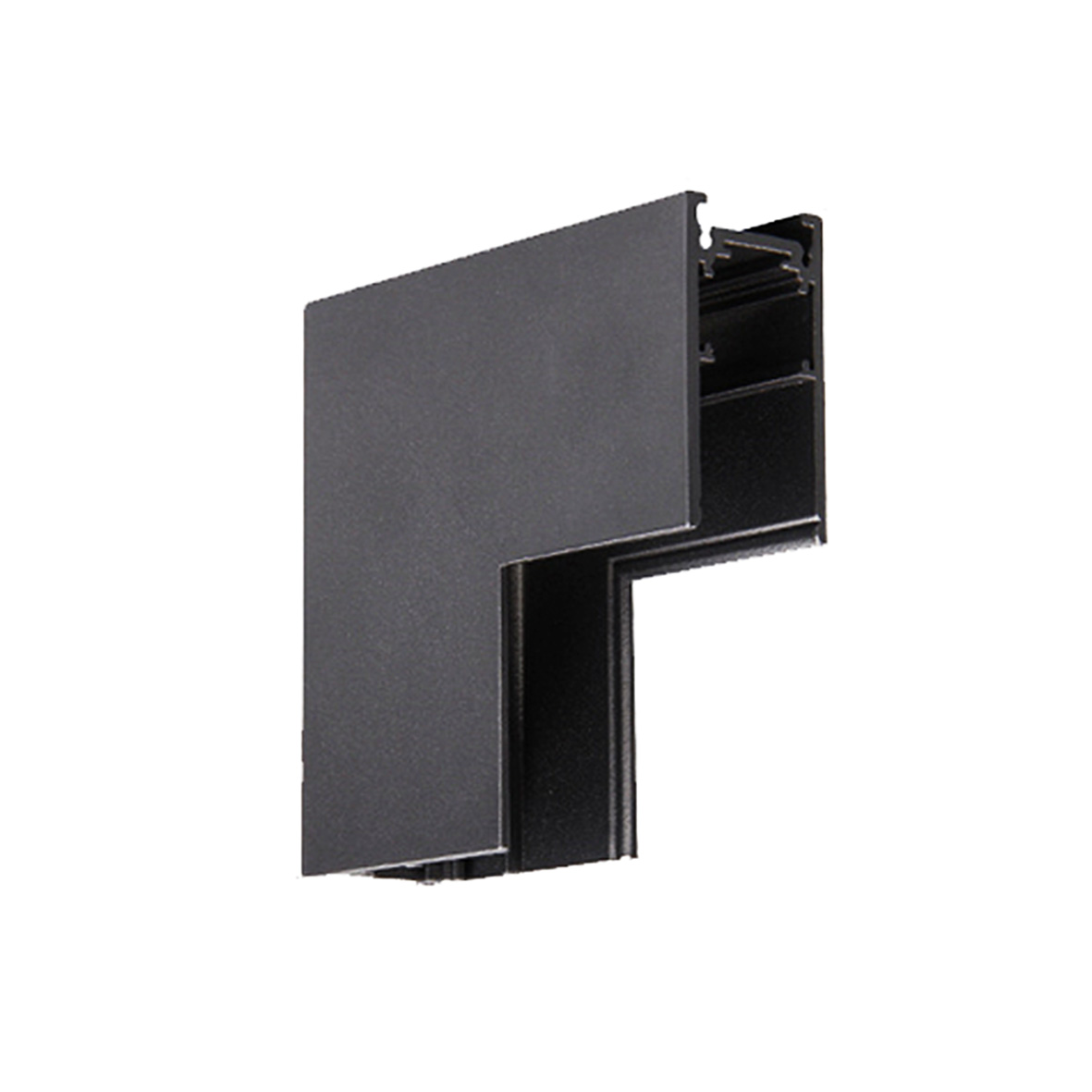 La combinazione tra il Connettore Angolare 90° Verticale e il connettore snodabile per Binari magnetici 48V da superficie è stata realizzata per creare e alimentare l'angolo tra due Binari magnetici a soffitto/parete. Si presenta senza sporgenze, quindi totalmente a scomparsa.