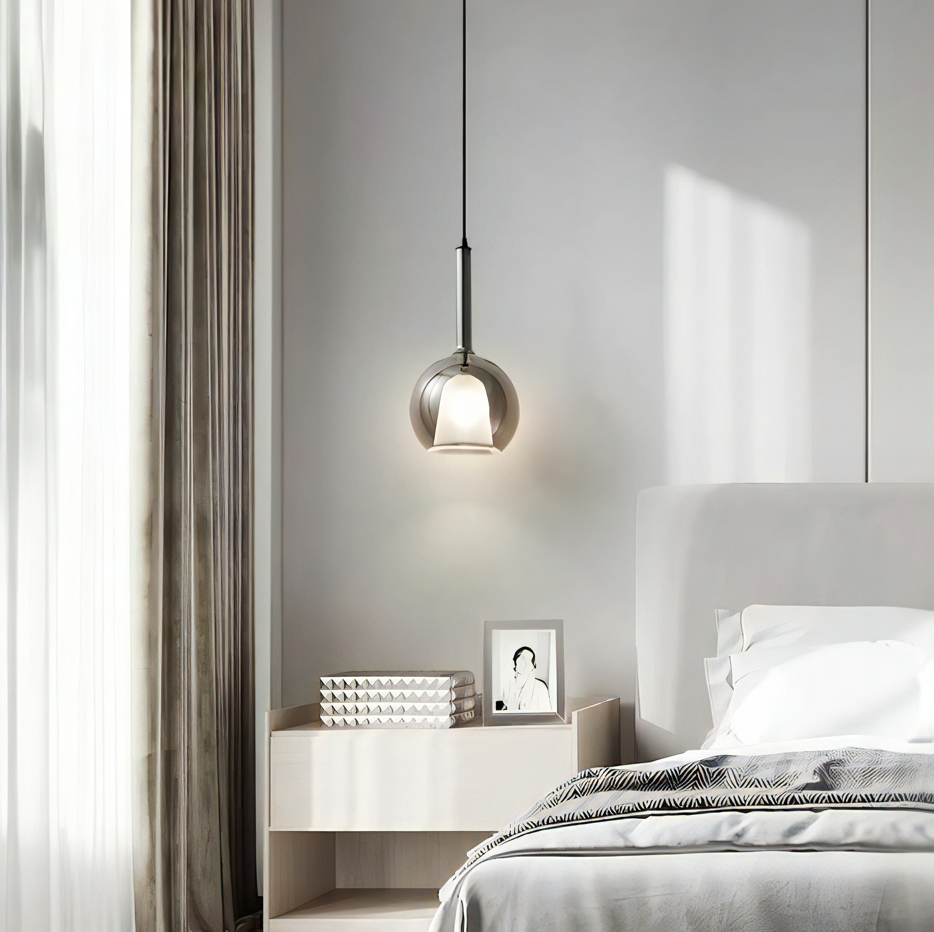 Lampada a sospensione singola a LED in stile elegante e moderno di forma sferica in vetro specchio fumè.
