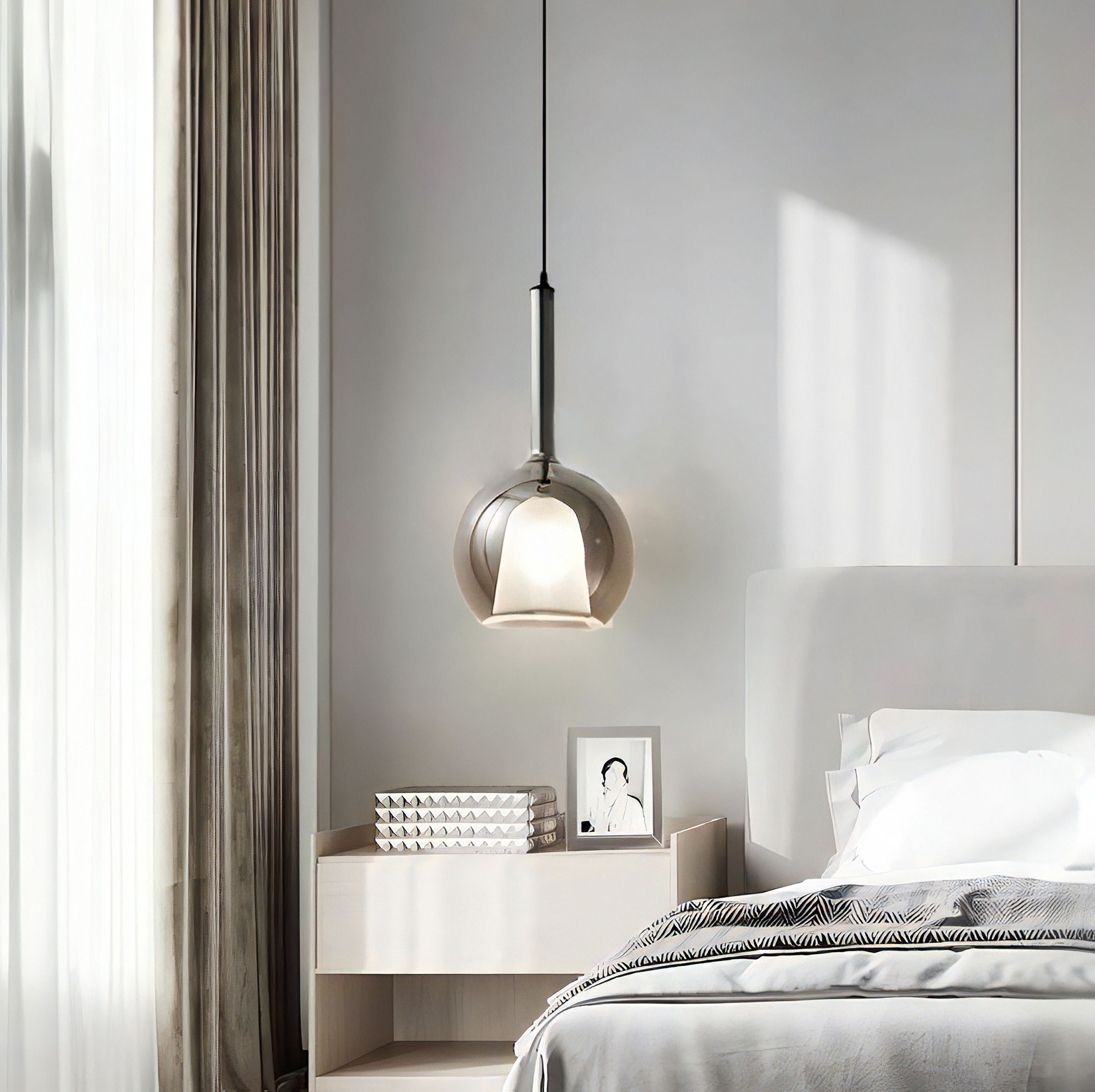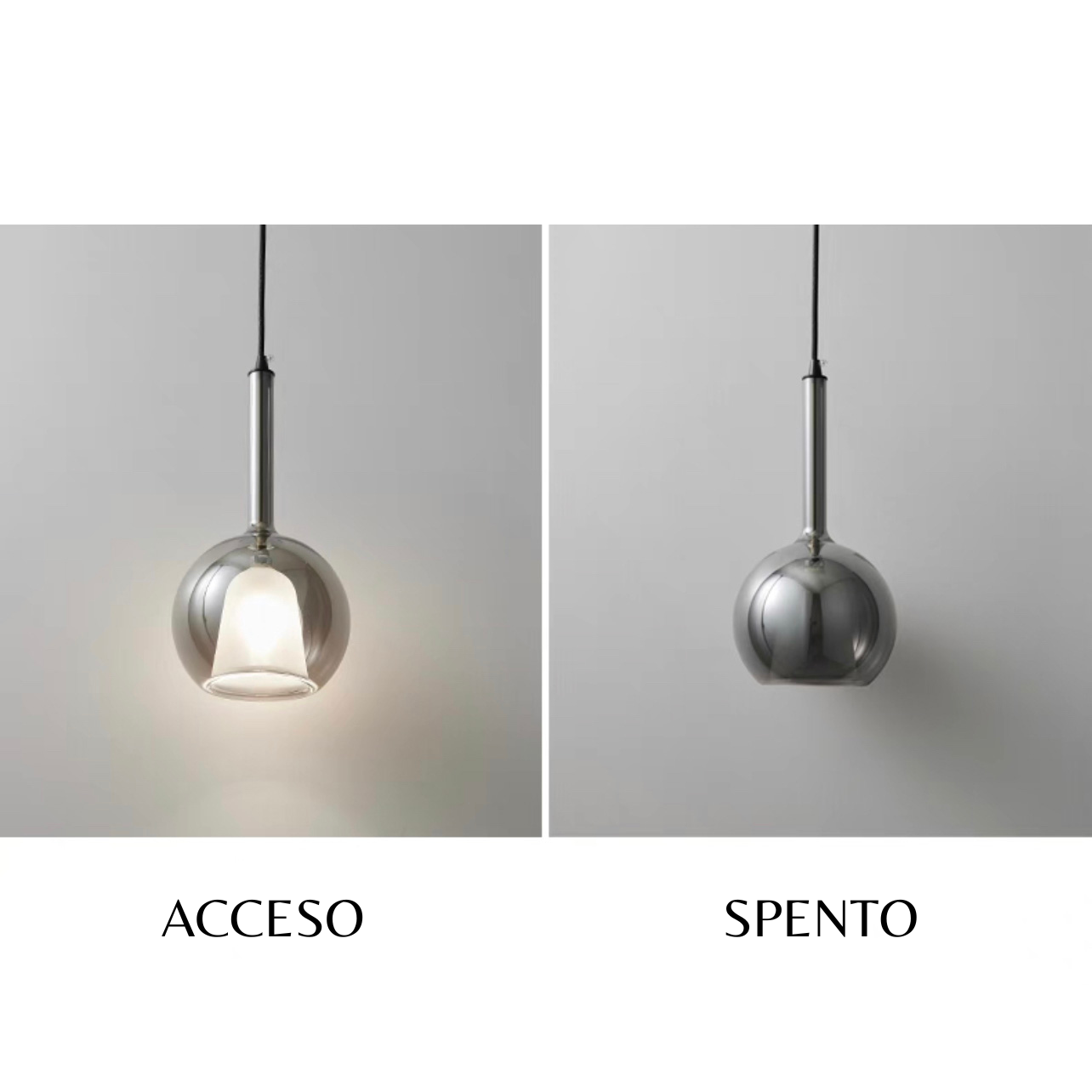 Lampada a sospensione singola a LED in stile elegante e moderno di forma sferica in vetro specchio fumè.