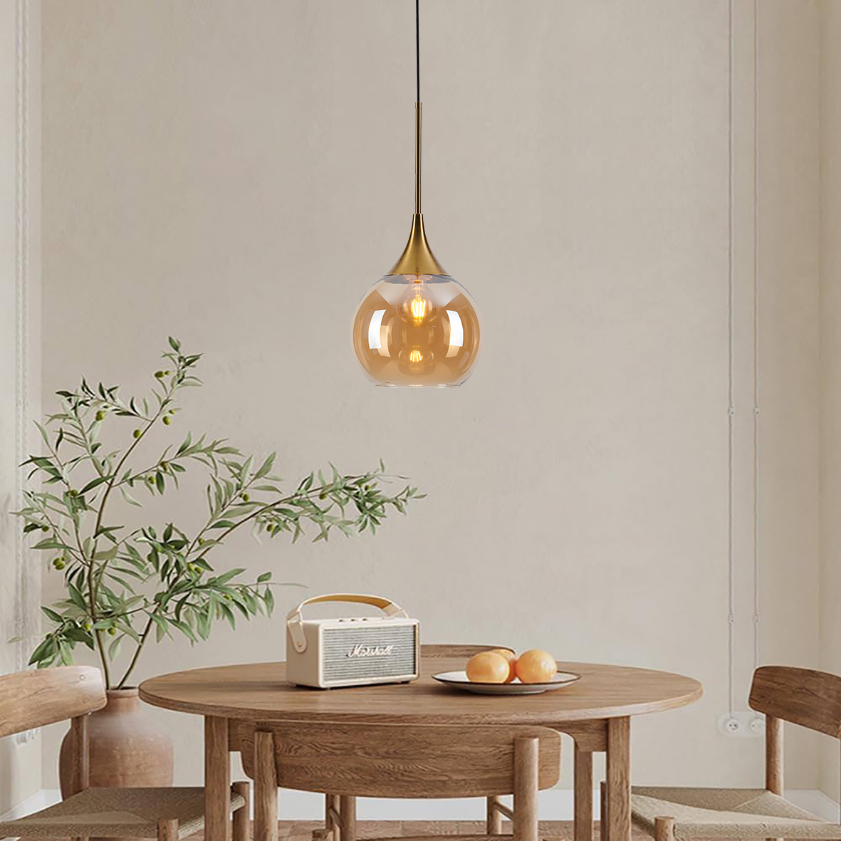 Lampada a sospensione singola a LED in stile elegante e moderno di forma sferica in vetro specchio ambrato.