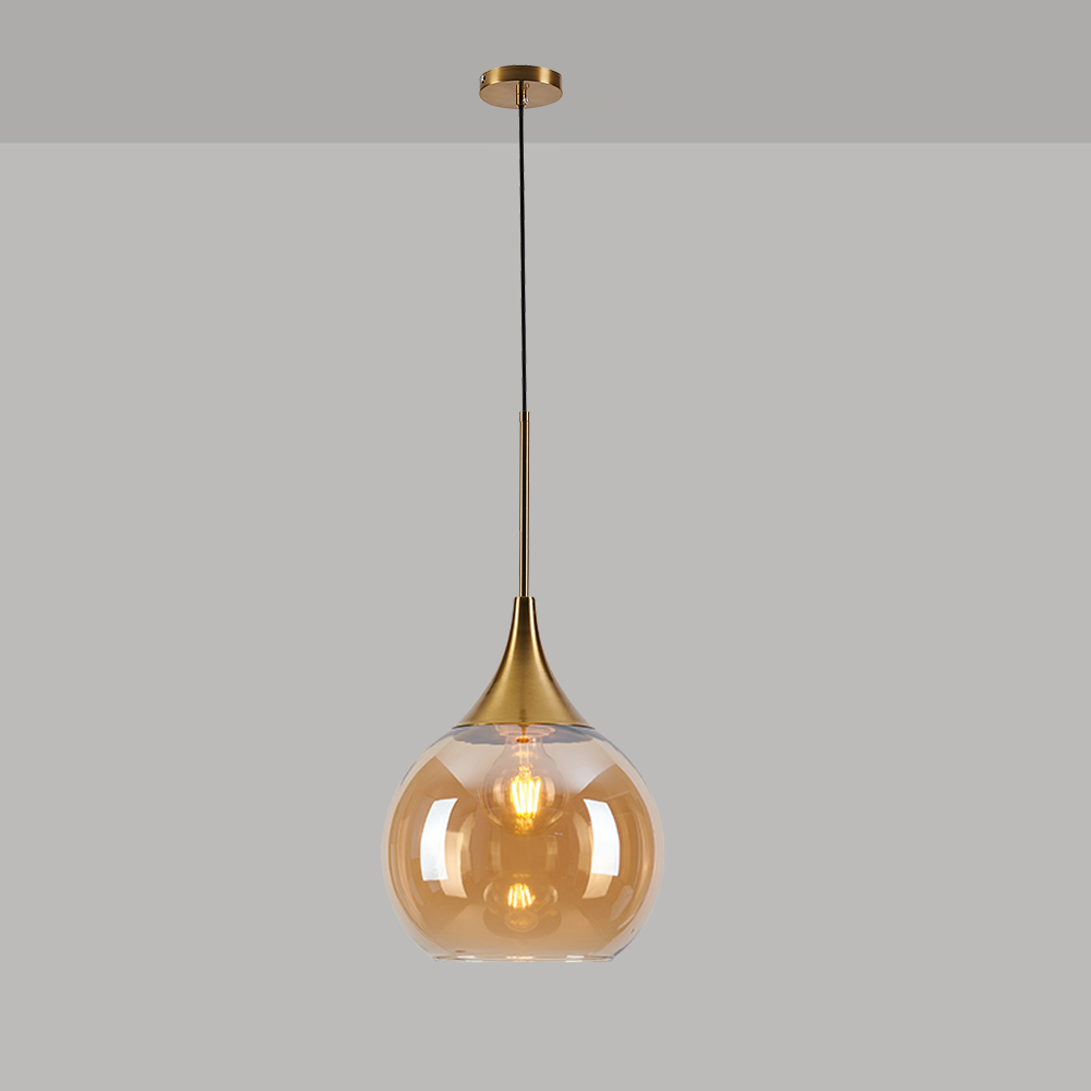 Lampada a sospensione singola a LED in stile elegante e moderno di forma sferica in vetro specchio ambrato.