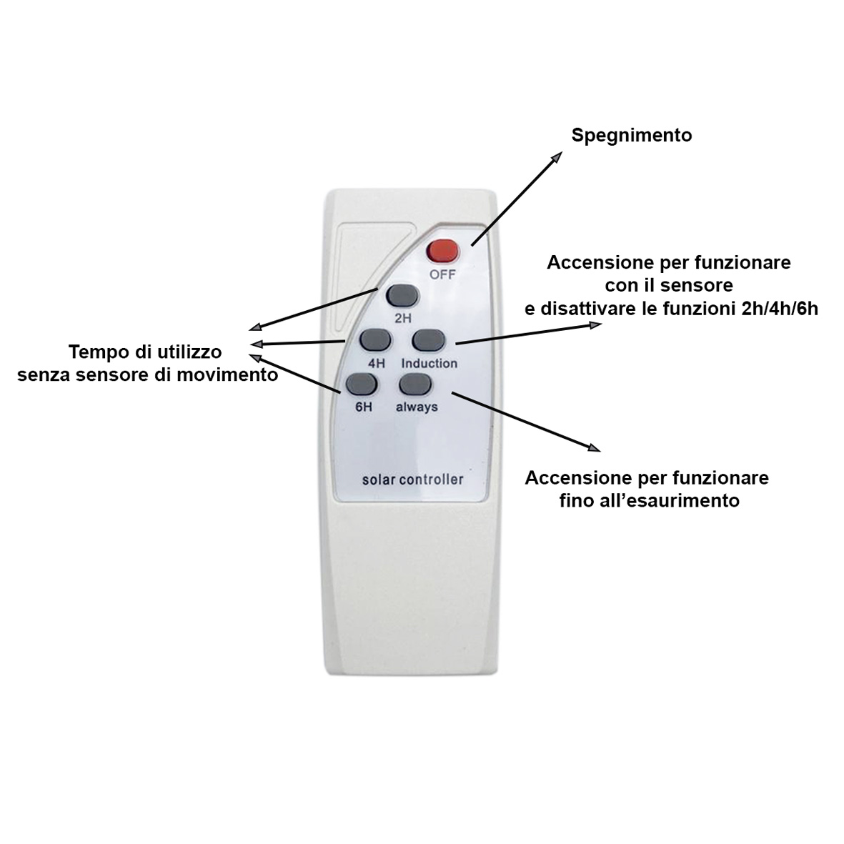 Il telecomando incluso nella confezione permette di comandare la lampada da una distanza di circa 8-10 metri e di impostare varie modalità del tempo di utlilizzo.