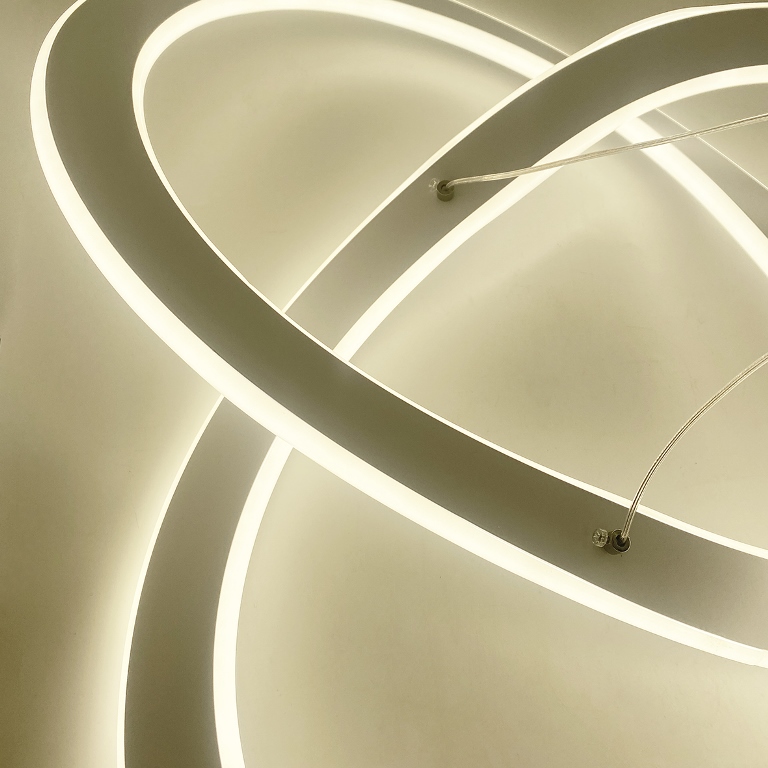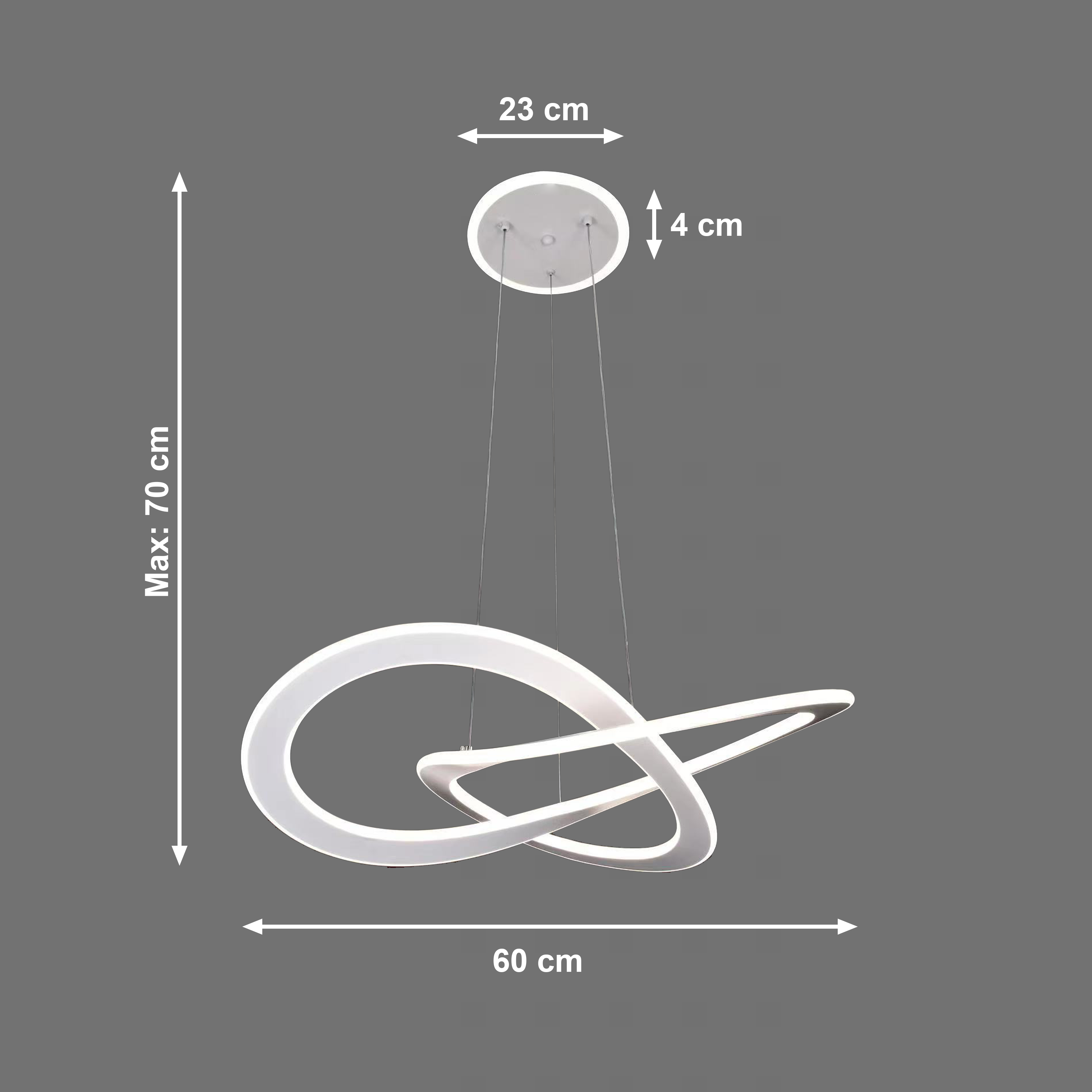 Questo lampadario a LED moderno sospensione è un'opera d'arte luminosa che unisce eleganza e funzionalità. Sospeso da cavi regolabili, il lampadario presenta un design dinamico con anelli LED intrecciati e sfere decorative luminose, creando una danza visiva di luce e forma. Il contrasto tra la finitura bianca dei componenti e l'intenso sfondo viola aggiunge un tocco drammatico, rendendolo un punto focale straordinario in qualsiasi ambiente. Ideale per spazi contemporanei, questo lampadario non solo illumina lo spazio con una luce brillante ed efficiente ma funge anche da pezzo centrale decorativo in salotti, ingressi o sopra il tavolo da pranzo. L'illuminazione LED integrata assicura efficienza energetica e una lunga durata, rendendo questa lampada una scelta sostenibile ed elegante per la casa moderna.