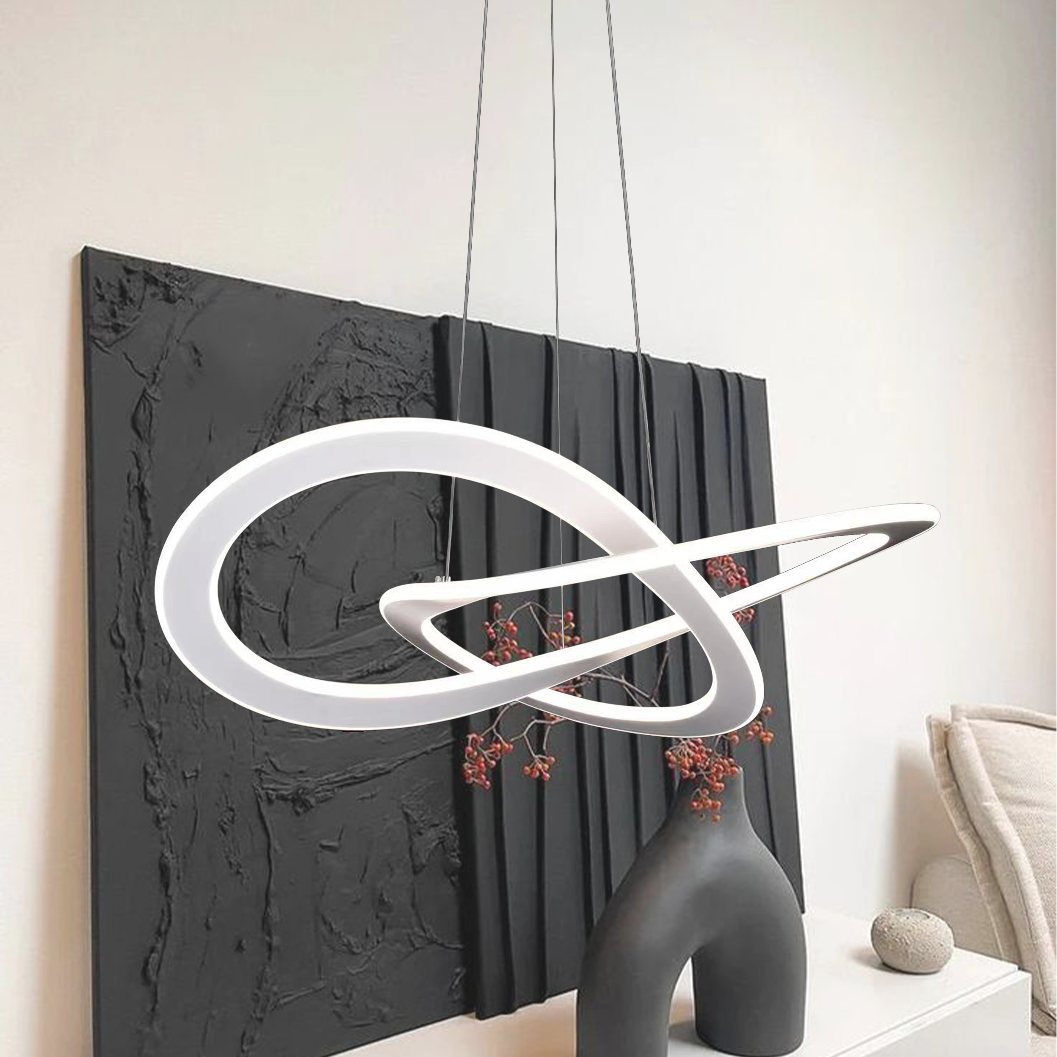 Questo lampadario a LED moderno sospensione è un'opera d'arte luminosa che unisce eleganza e funzionalità. Sospeso da cavi regolabili, il lampadario presenta un design dinamico con anelli LED intrecciati e sfere decorative luminose, creando una danza visiva di luce e forma. Il contrasto tra la finitura bianca dei componenti e l'intenso sfondo viola aggiunge un tocco drammatico, rendendolo un punto focale straordinario in qualsiasi ambiente. Ideale per spazi contemporanei, questo lampadario non solo illumina lo spazio con una luce brillante ed efficiente ma funge anche da pezzo centrale decorativo in salotti, ingressi o sopra il tavolo da pranzo. L'illuminazione LED integrata assicura efficienza energetica e una lunga durata, rendendo questa lampada una scelta sostenibile ed elegante per la casa moderna.