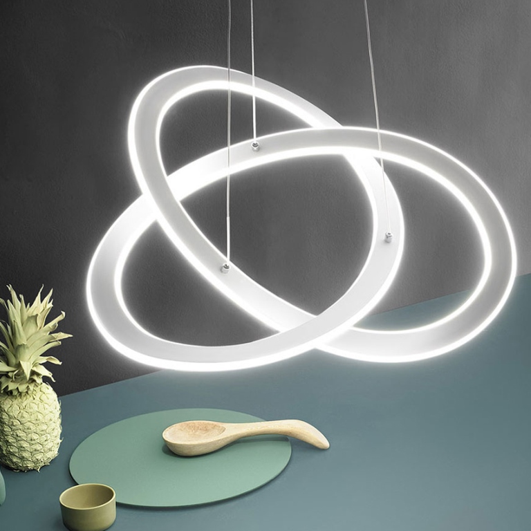 Questo lampadario a LED moderno sospensione è un'opera d'arte luminosa che unisce eleganza e funzionalità. Sospeso da cavi regolabili, il lampadario presenta un design dinamico con anelli LED intrecciati e sfere decorative luminose, creando una danza visiva di luce e forma. Il contrasto tra la finitura bianca dei componenti e l'intenso sfondo viola aggiunge un tocco drammatico, rendendolo un punto focale straordinario in qualsiasi ambiente. Ideale per spazi contemporanei, questo lampadario non solo illumina lo spazio con una luce brillante ed efficiente ma funge anche da pezzo centrale decorativo in salotti, ingressi o sopra il tavolo da pranzo. L'illuminazione LED integrata assicura efficienza energetica e una lunga durata, rendendo questa lampada una scelta sostenibile ed elegante per la casa moderna.