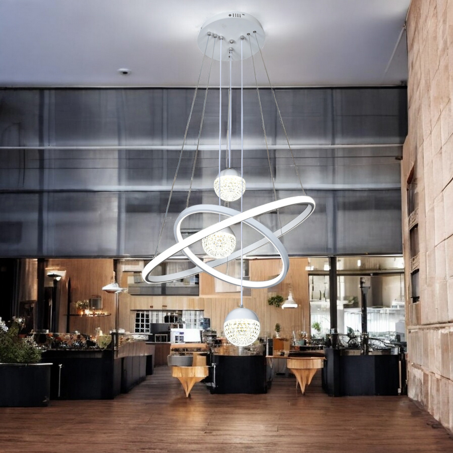 Questo lampadario a LED moderno è un'opera d'arte luminosa che unisce eleganza e funzionalità. Sospeso da cavi regolabili, il lampadario presenta un design dinamico con anelli LED intrecciati e sfere decorative luminose, creando una danza visiva di luce e forma. Il contrasto tra la finitura bianca dei componenti e l'intenso sfondo viola aggiunge un tocco drammatico, rendendolo un punto focale straordinario in qualsiasi ambiente. Ideale per spazi contemporanei, questo lampadario non solo illumina lo spazio con una luce brillante ed efficiente ma funge anche da pezzo centrale decorativo in salotti, ingressi o sopra il tavolo da pranzo. L'illuminazione LED integrata assicura efficienza energetica e una lunga durata, rendendo questa lampada una scelta sostenibile ed elegante per la casa moderna.