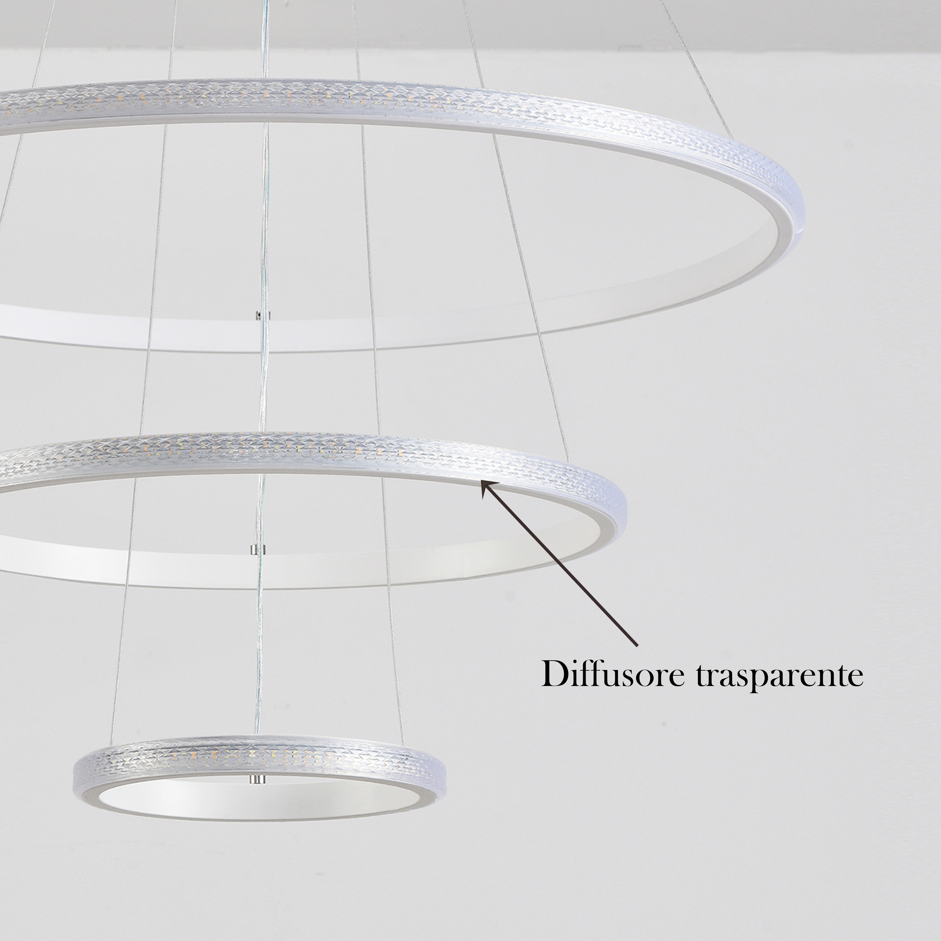Lampadario a sospensione composto da tre cerchi concentrici, si presenta con uno stile di design moderno e contemporaneo, con possibiltà di cambiare 3 tonalità di luce calda 3000k, naturale 4200k e fredda 6400k.