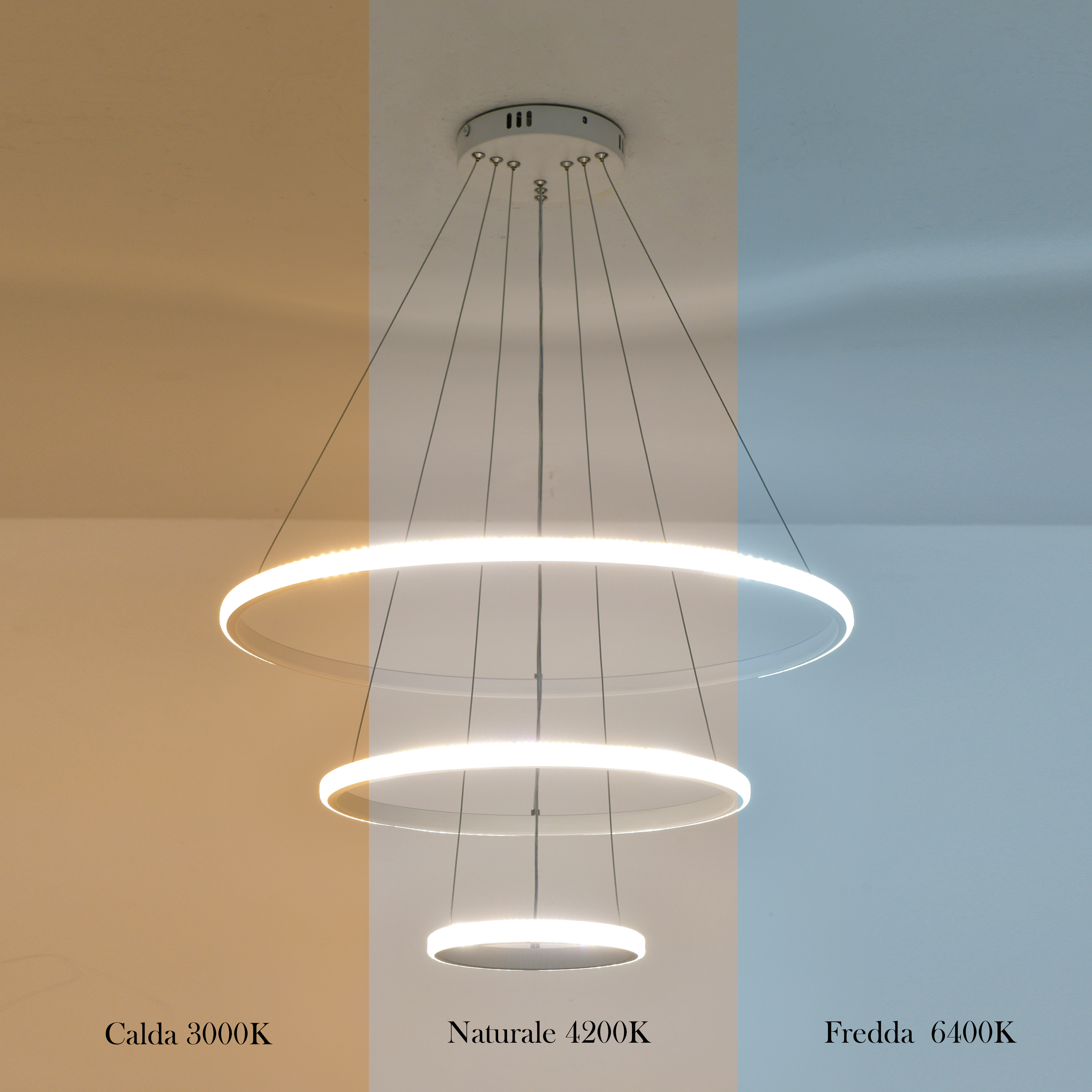 Lampadario a sospensione composto da tre cerchi concentrici, si presenta con uno stile di design moderno e contemporaneo, con possibiltà di cambiare 3 tonalità di luce calda 3000k, naturale 4200k e fredda 6400k.
