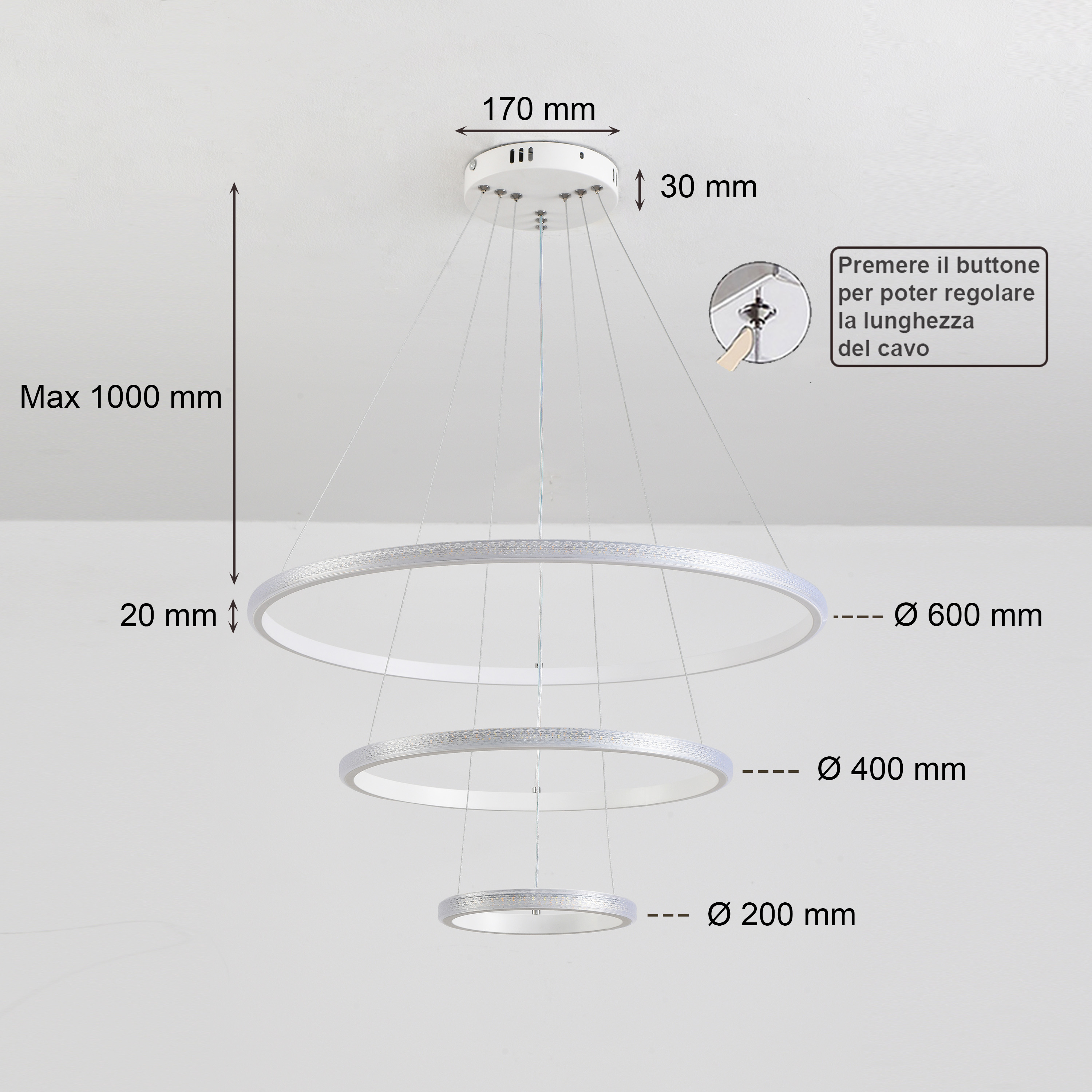 Lampadario a sospensione composto da tre cerchi concentrici, si presenta con uno stile di design moderno e contemporaneo, con possibiltà di cambiare 3 tonalità di luce calda 3000k, naturale 4200k e fredda 6400k.
