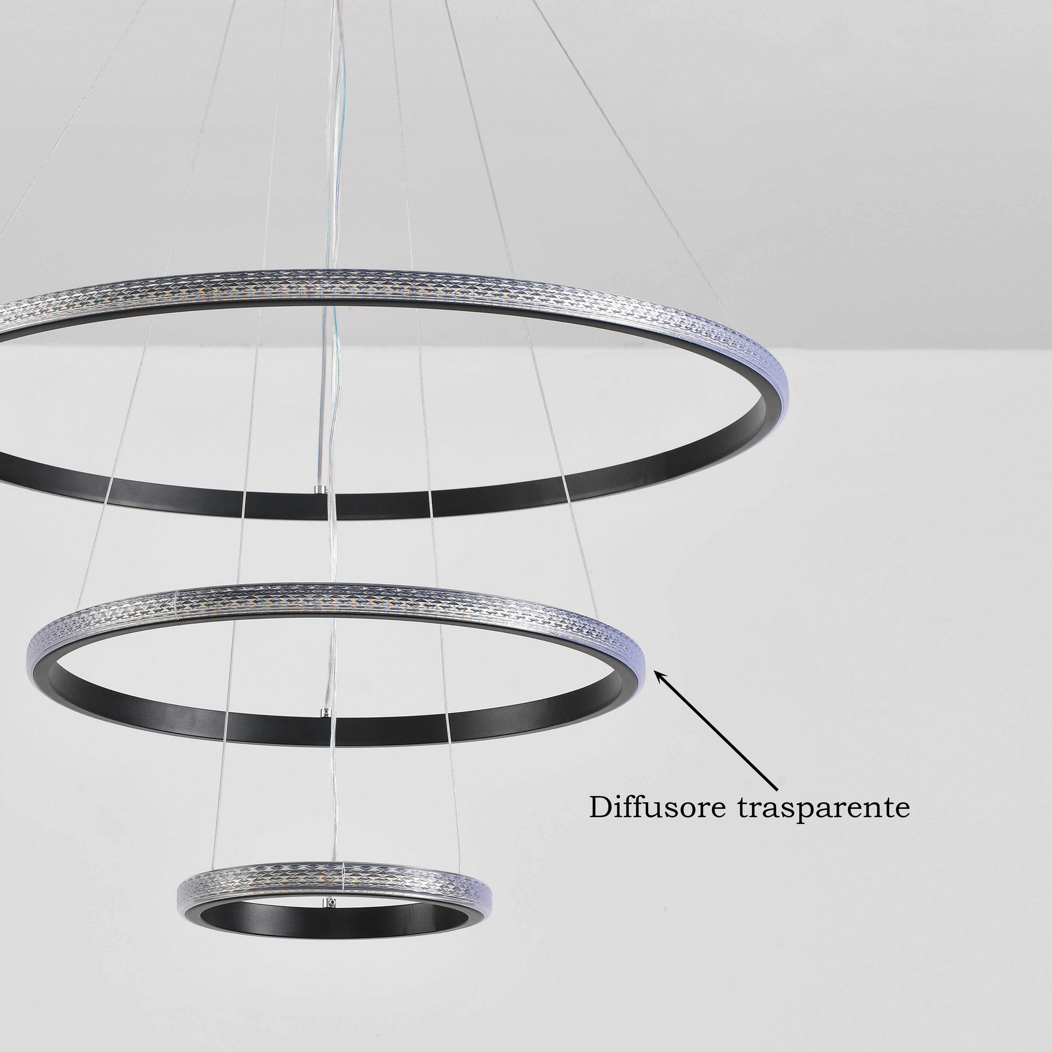 Lampadario a sospensione composto da tre cerchi concentrici, si presenta con uno stile di design moderno e contemporaneo, con possibilità di cambiare 3 tonalità di luce calda 3000 K, naturale 4200 K e fredda 6400 K.