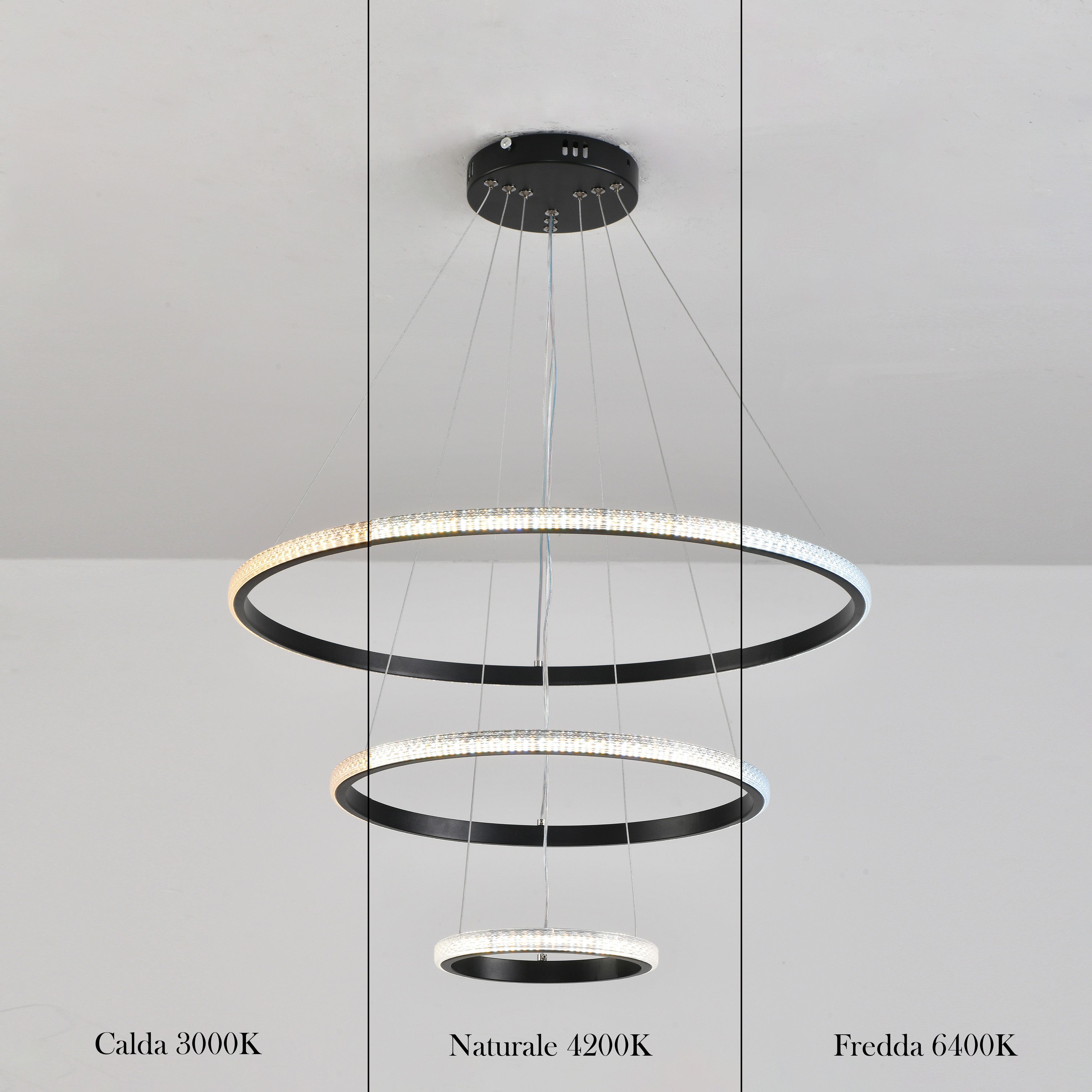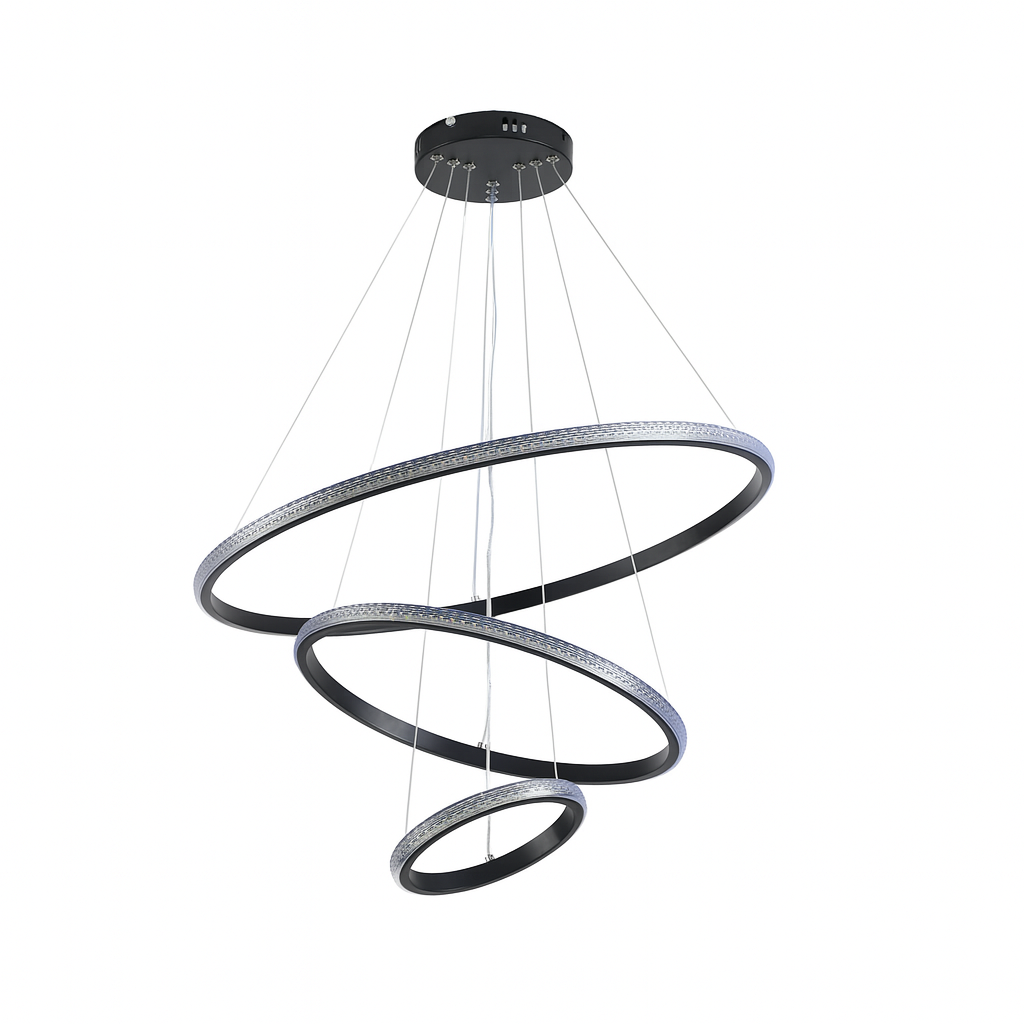 Lampadario a sospensione composto da tre cerchi concentrici, si presenta con uno stile di design moderno e contemporaneo, con possibilità di cambiare 3 tonalità di luce calda 3000 K, naturale 4200 K e fredda 6400 K.