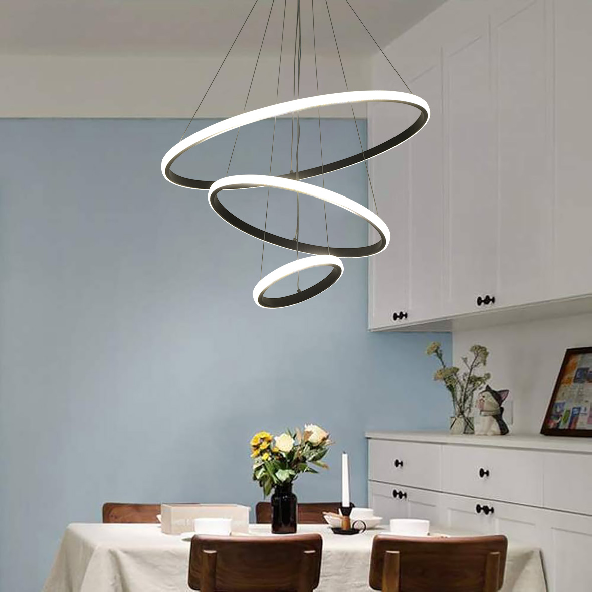 Lampadario a sospensione composto da tre cerchi concentrici, si presenta con uno stile di design moderno e contemporaneo, con possibilità di cambiare 3 tonalità di luce calda 3000 K, naturale 4200 K e fredda 6400 K.