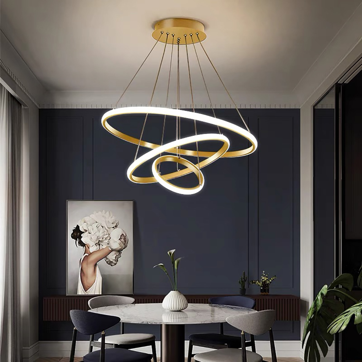 Lampadario a sospensione composto da tre cerchi concentrici, si presenta con uno stile di design moderno e contemporaneo, con possibilità di cambiare 3 tonalità di luce calda 3000 K, naturale 4200 K e fredda 6400 K.