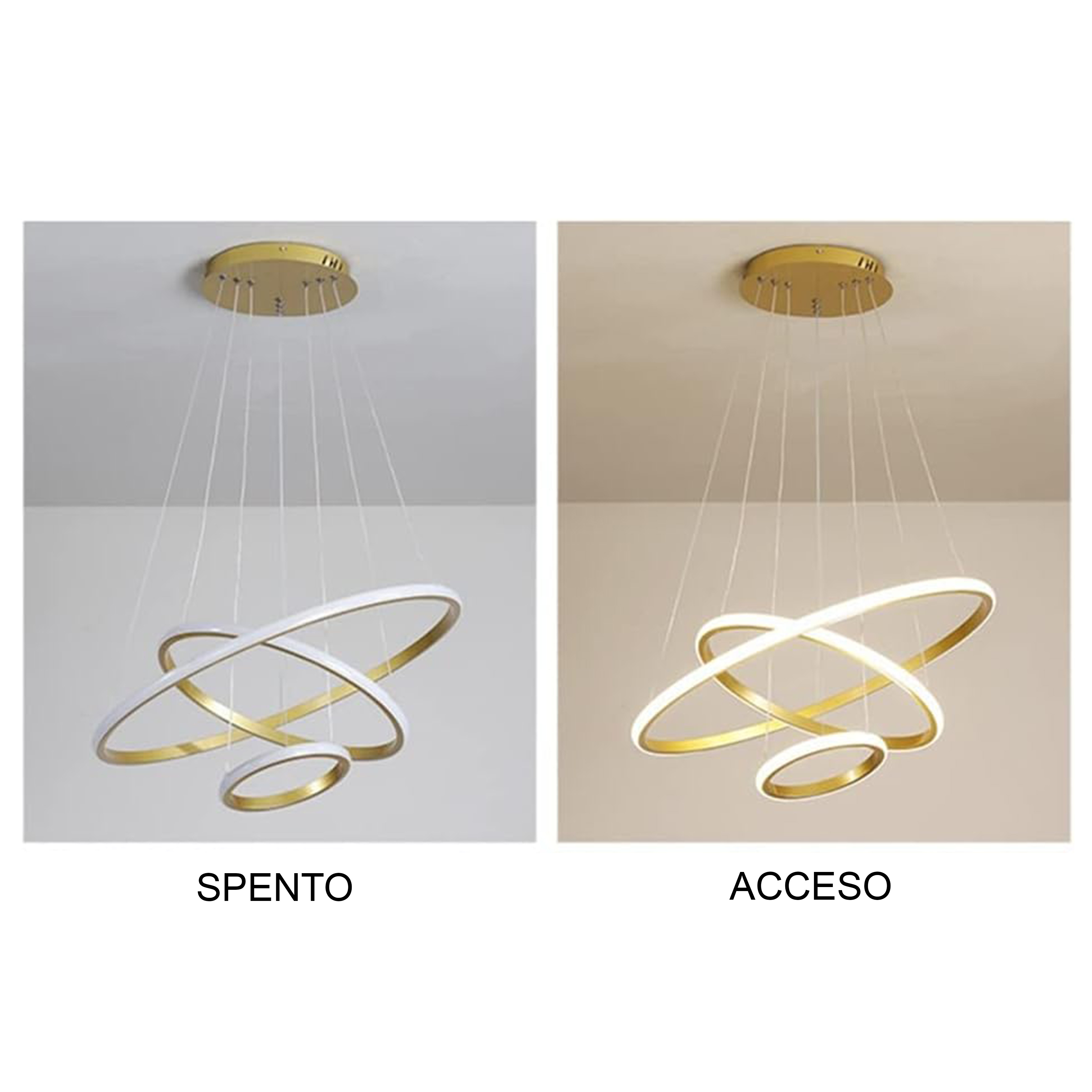 Lampadario a sospensione composto da tre cerchi concentrici, si presenta con uno stile di design moderno e contemporaneo, con possibilità di cambiare 3 tonalità di luce calda 3000 K, naturale 4200 K e fredda 6400 K.