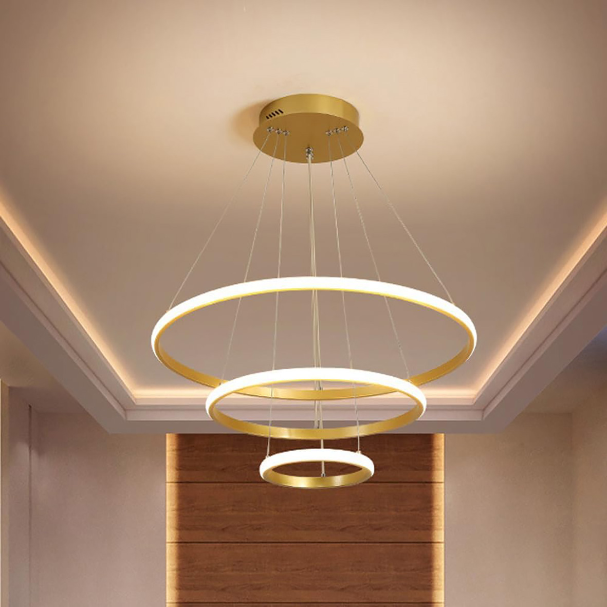 Lampadario a sospensione composto da tre cerchi concentrici, si presenta con uno stile di design moderno e contemporaneo, con possibilità di cambiare 3 tonalità di luce calda 3000 K, naturale 4200 K e fredda 6400 K.