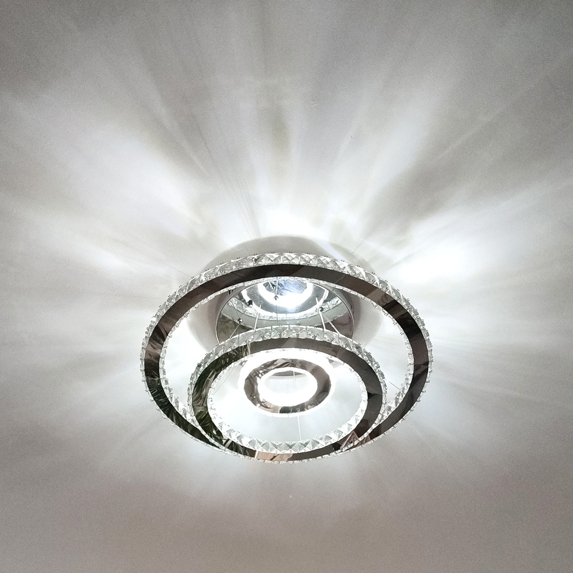 Questo lampadario di cristallo circolare presenta un design moderno e contemporaneo. E' costituito da 3 cerchi concentrici illuminati da luce LED ad alta efficienza energetica compongono questo splendido lampadario.
