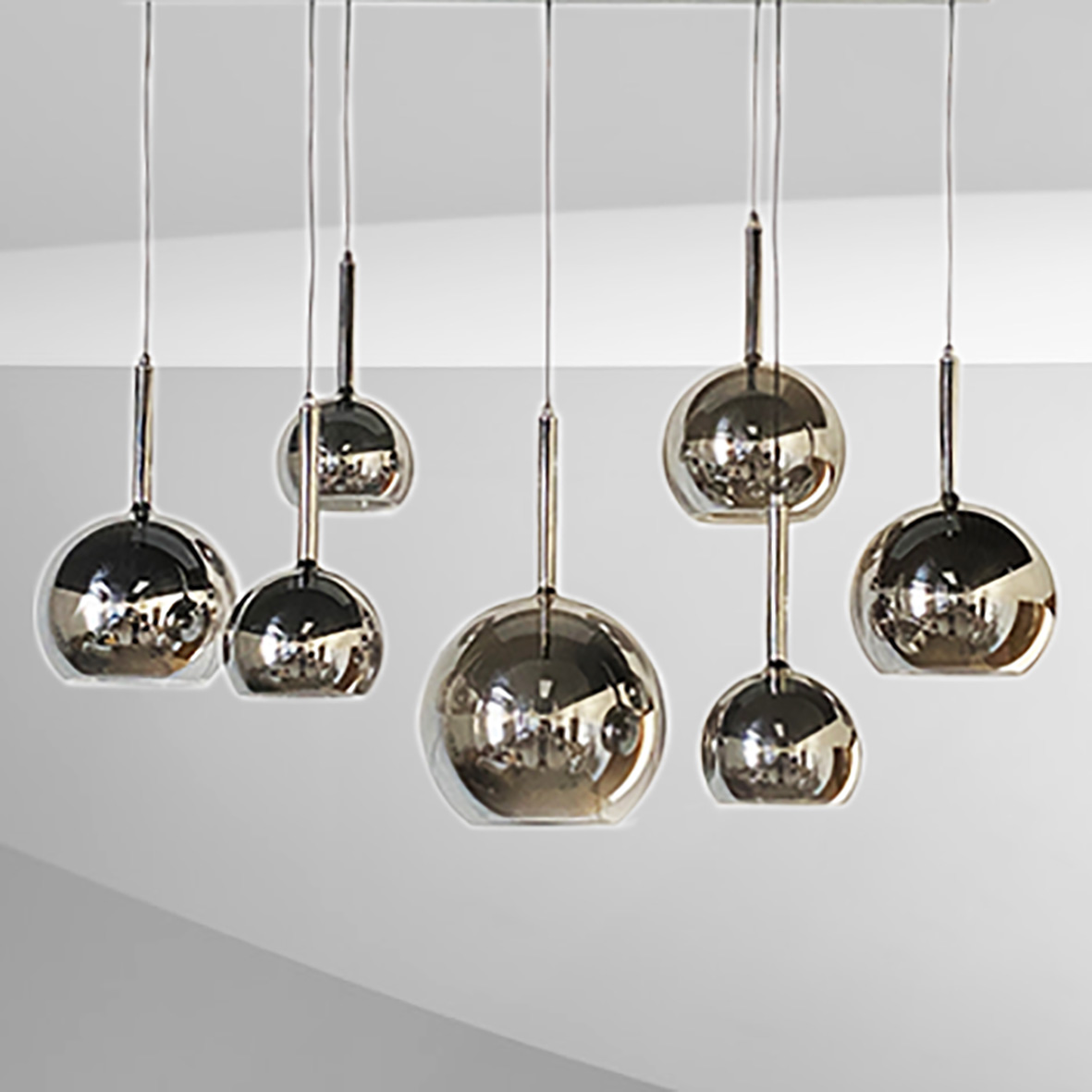 Lampadario a sospensione a LED con sfere in stile elegante e moderno. Il lampadario è realizzato con 7 pendenti di diverse dimensioni a forma di sfera in vetro specchio fumè.