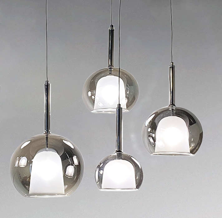 Lampadario a sospensione a LED con sfere in stile elegante e moderno. Il lampadario è realizzato con 7 pendenti di diverse dimensioni a forma di sfera in vetro specchio fumè.