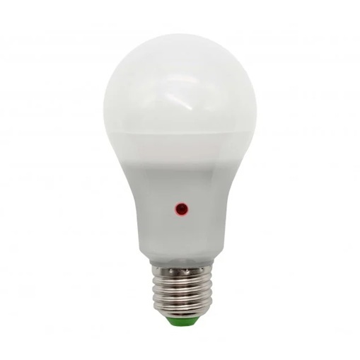 Lampadina LED con potenza di 9W e attacco E27. Forma a Bulbo in materiale plastico bianco con fascio luminoso di 220°.