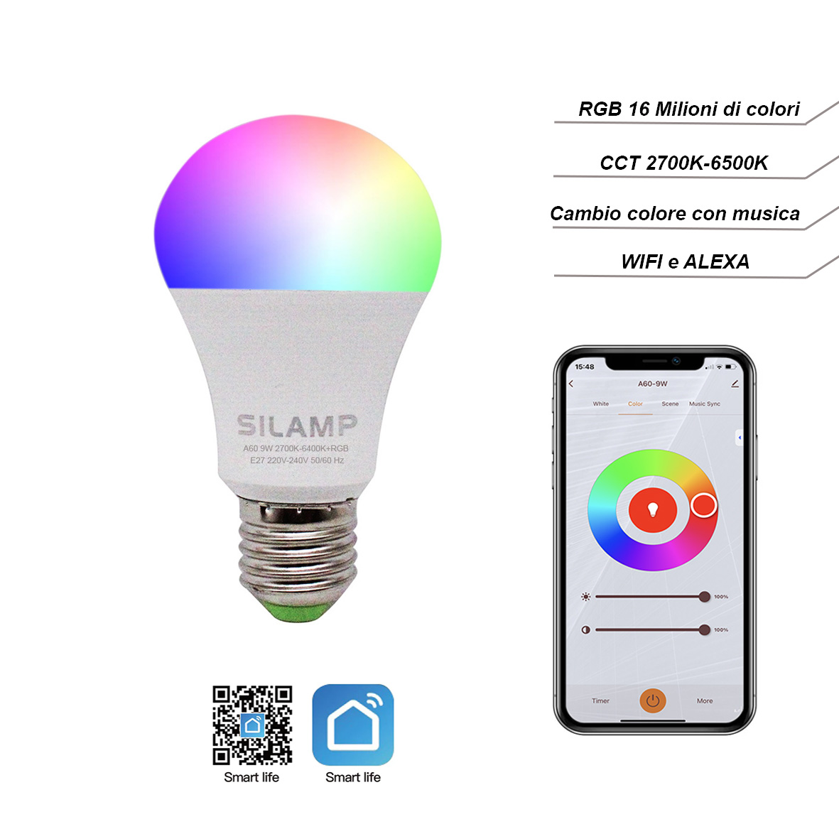 Questa lampadina è ideale per chi vuole un tocco di colore in casa o negozi. Si possono scegliere 16 milioni di colori, regolare la luce dal bianco caldo 2700k al bianco freddo 6500k e dimmerare la luminosità secondo preferenza.