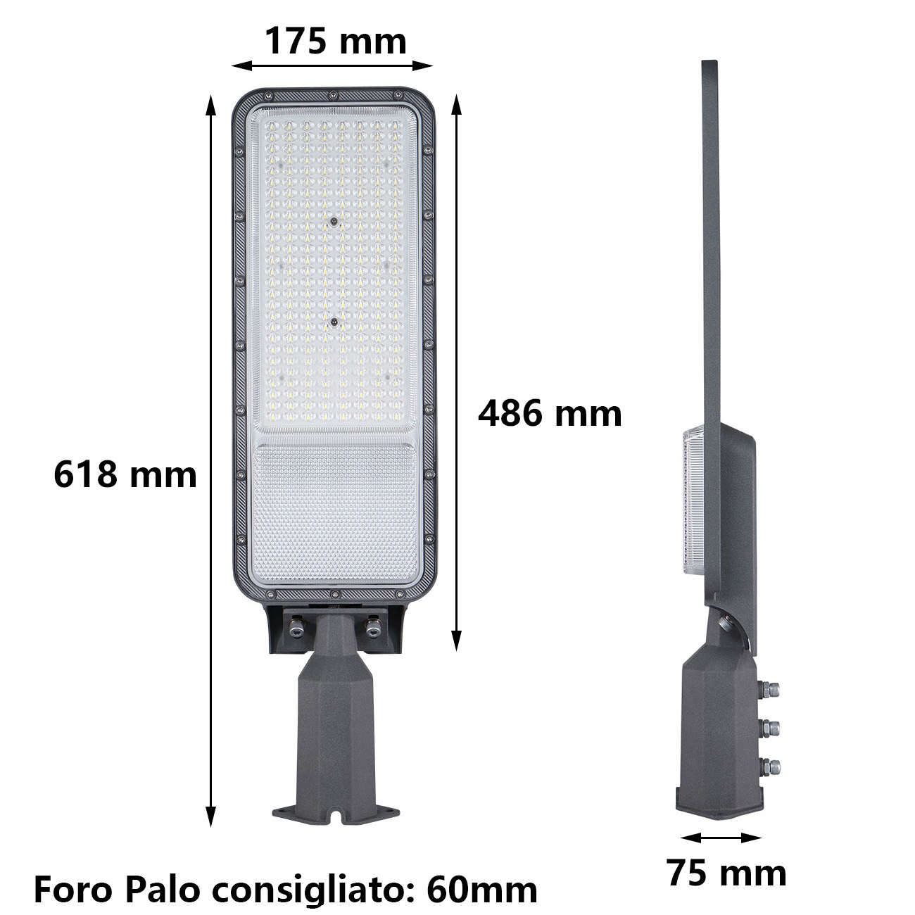 Questo lampione stradale a LED è un apparecchio di illuminazione professionale ad alta efficienza, progettato per la sostituzione dei vecchi sistemi di illuminazione stradale. Il corpo, realizzato in alluminio pressofuso, garantisce una lunga durata e un'elevata resistenza agli agenti atmosferici, con un grado di protezione IP65 che lo rende adatto per l'installazione in ambienti esterni.
