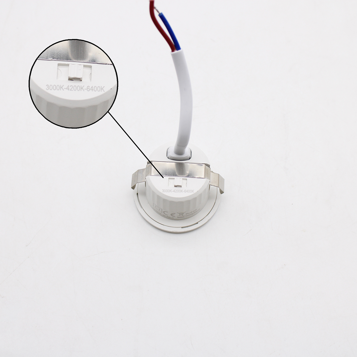 Lo switch integrato consente la selezione della temperatura colore tra 3000K, 4200K e 6400K, adattandosi a diverse esigenze luminose con un unico prodotto.