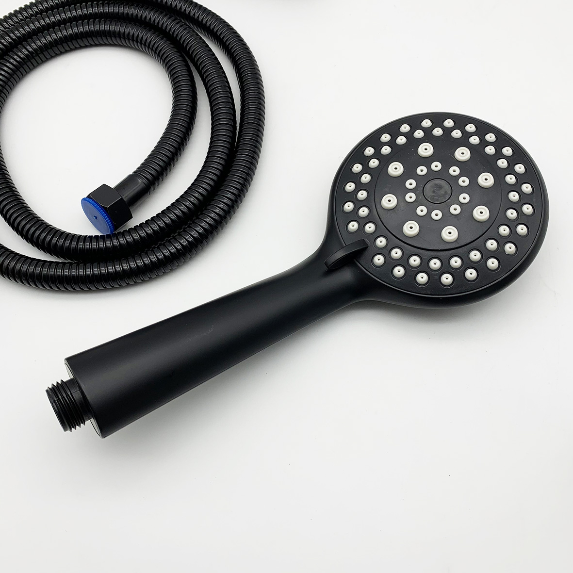 mitigeur en laiton noir mat ; tuyau et pomme de douche en aluminium; Joints et butées en PVC peints en argent métallisé