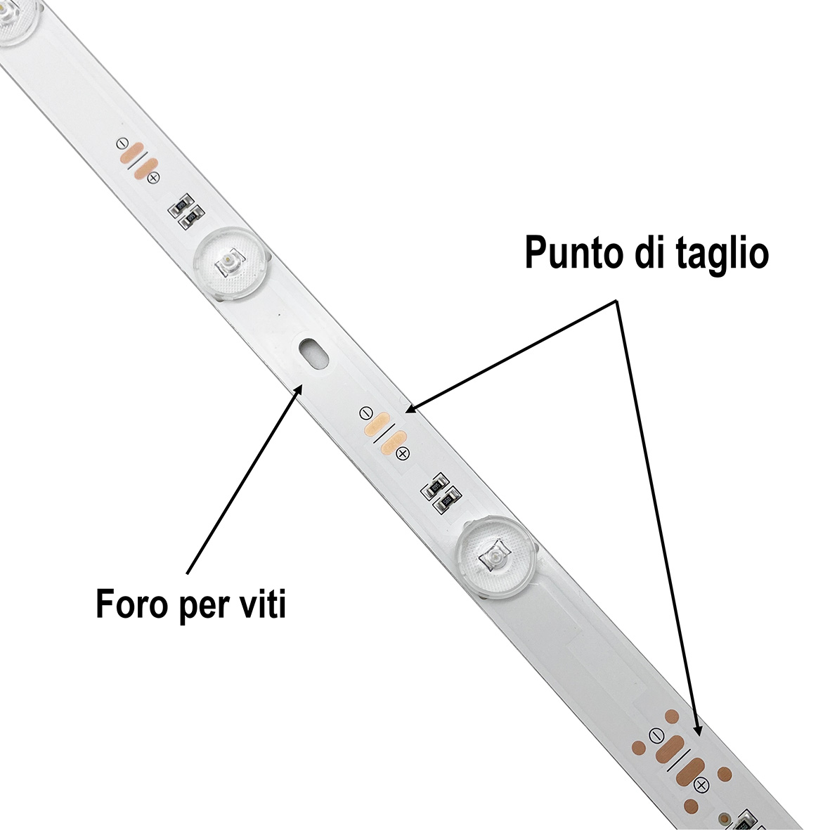 Questa barra è tagliabile a ogni banchina di un led (vedi foto) tramite apposito seghetto per alluminio.
