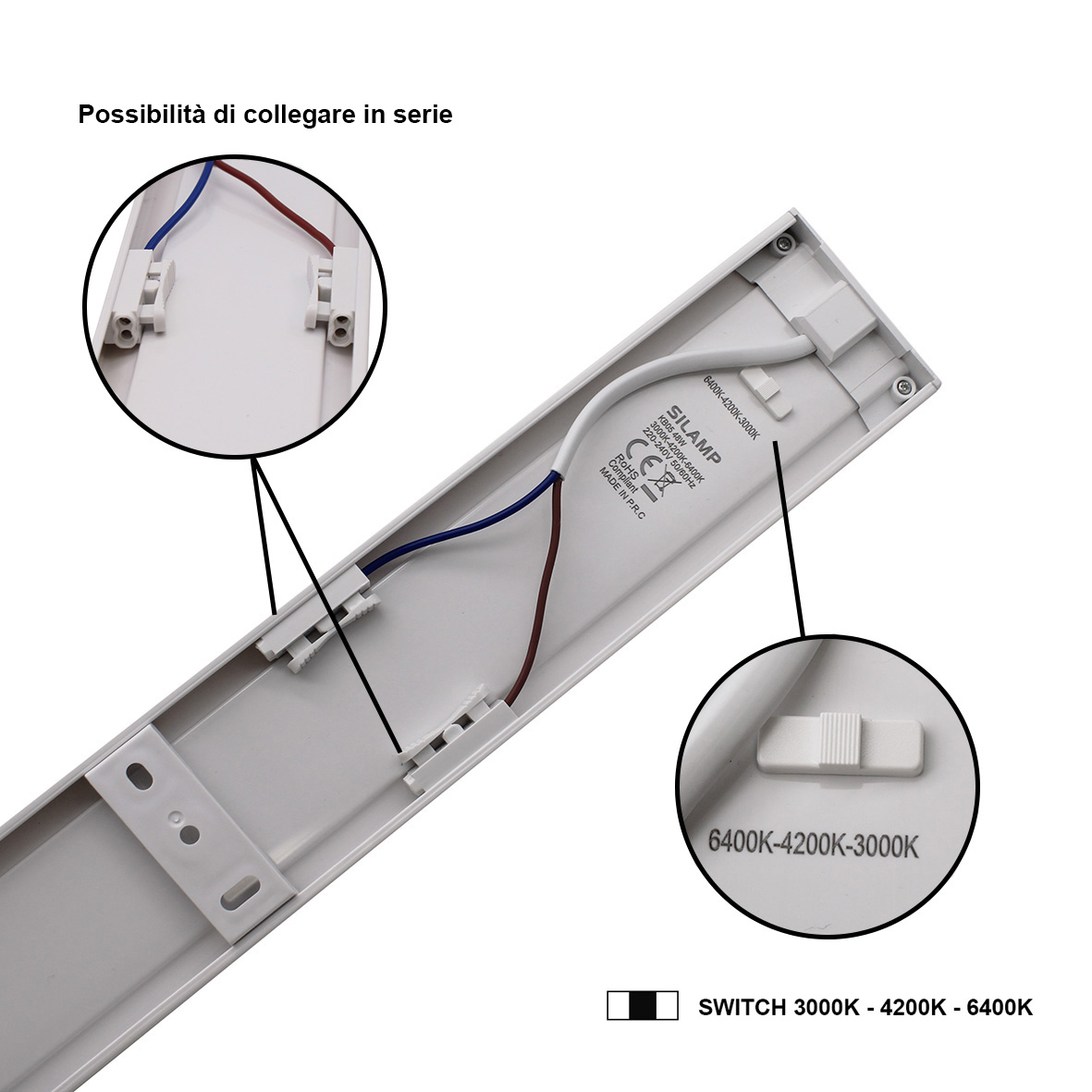 La plafoniera funziona direttamente alla rete elettrica 220V e ciò che lo rende particolare è il suo morsetto, che possiede due fori per Fase e altri due per il Neutro, pertanto è possibile collegare le plafoniere in SERIE. Inoltre, la plafoniera sul retro possiede uno SWITCH o meglio un pulsante con il quale è possibile variare la tonalità di luce: 3000k-4200k-6400k.