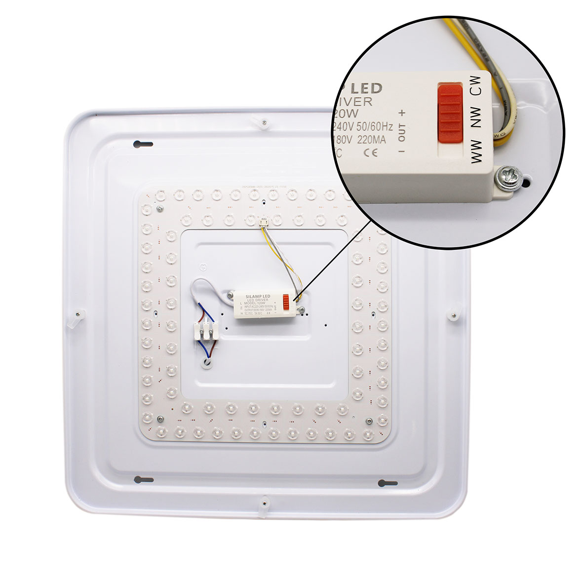 Design: Presenta una forma quadrata e piatta (pannello) con un profilo ultra-sottile, ideale per un montaggio a soffitto discreto.