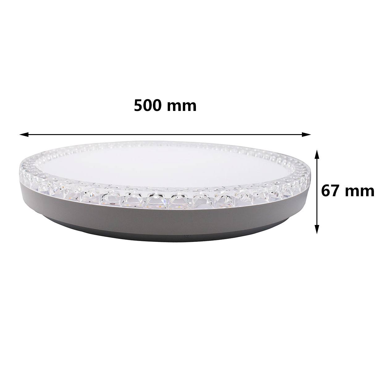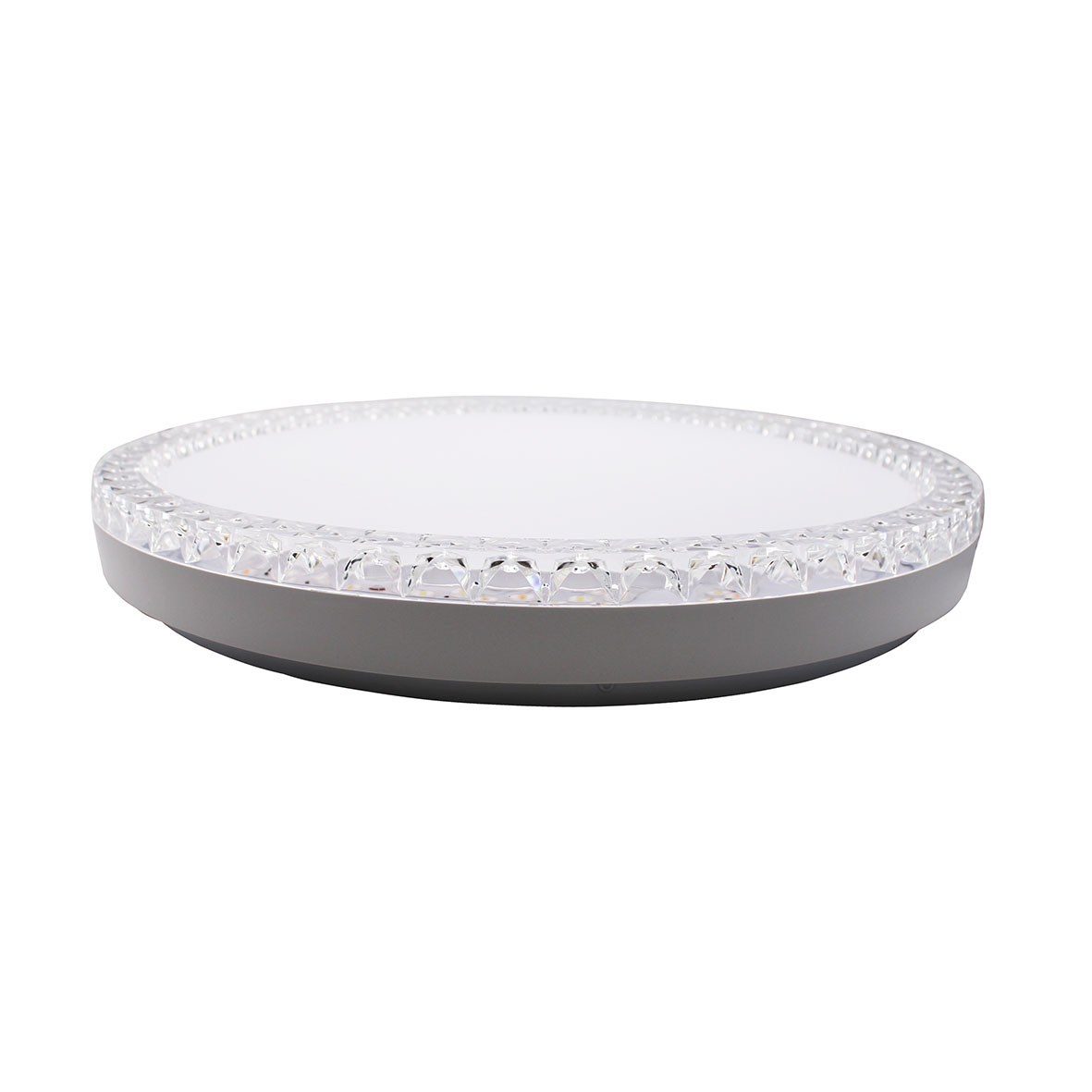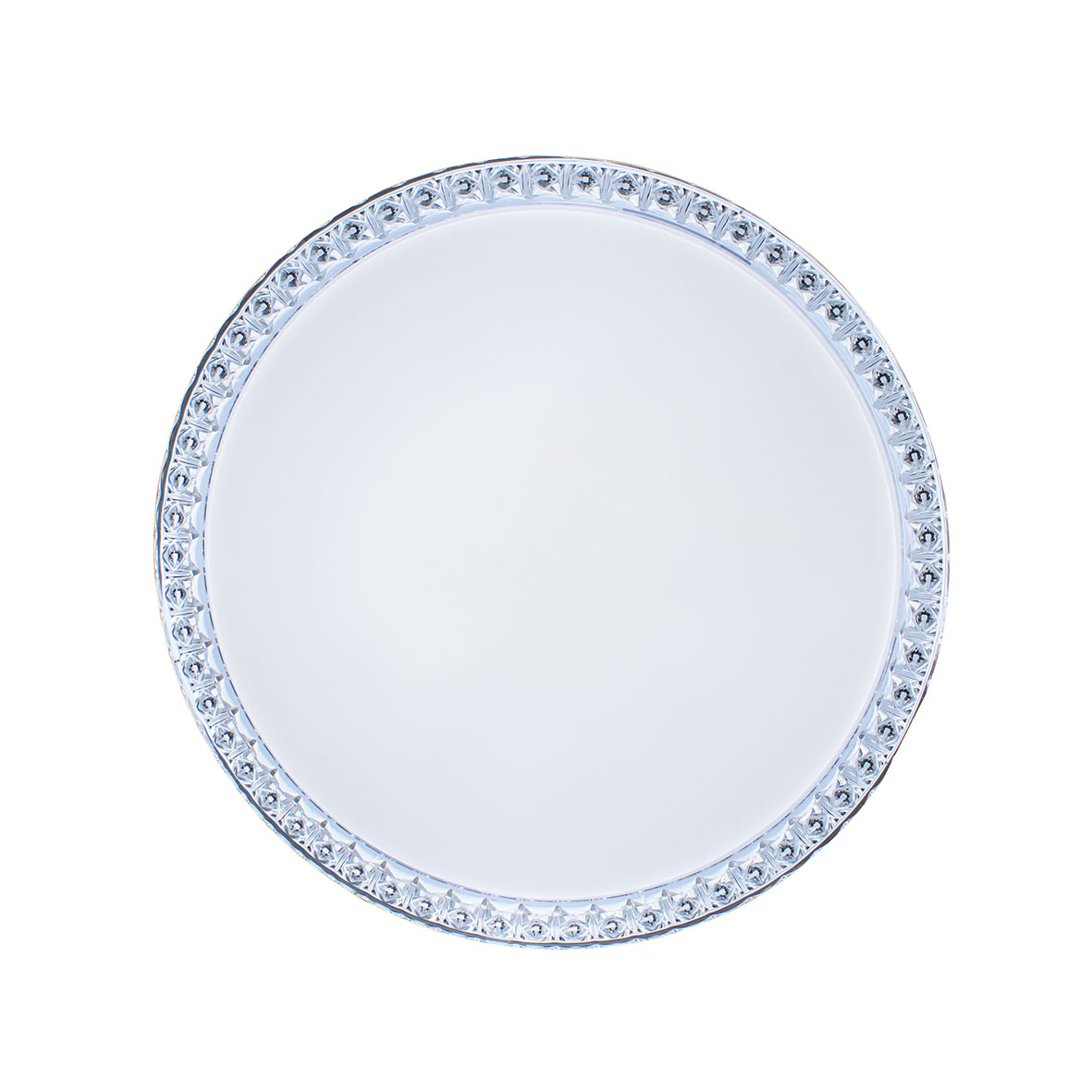 .Questa è una plafoniera a LED moderna ed elegante dal design circolare. Si distingue per il suo bordo perimetrale trasparente con una finitura a rilievo che simula il cristallo, creando un suggestivo effetto di luce scintillante quando la lampada è accesa.