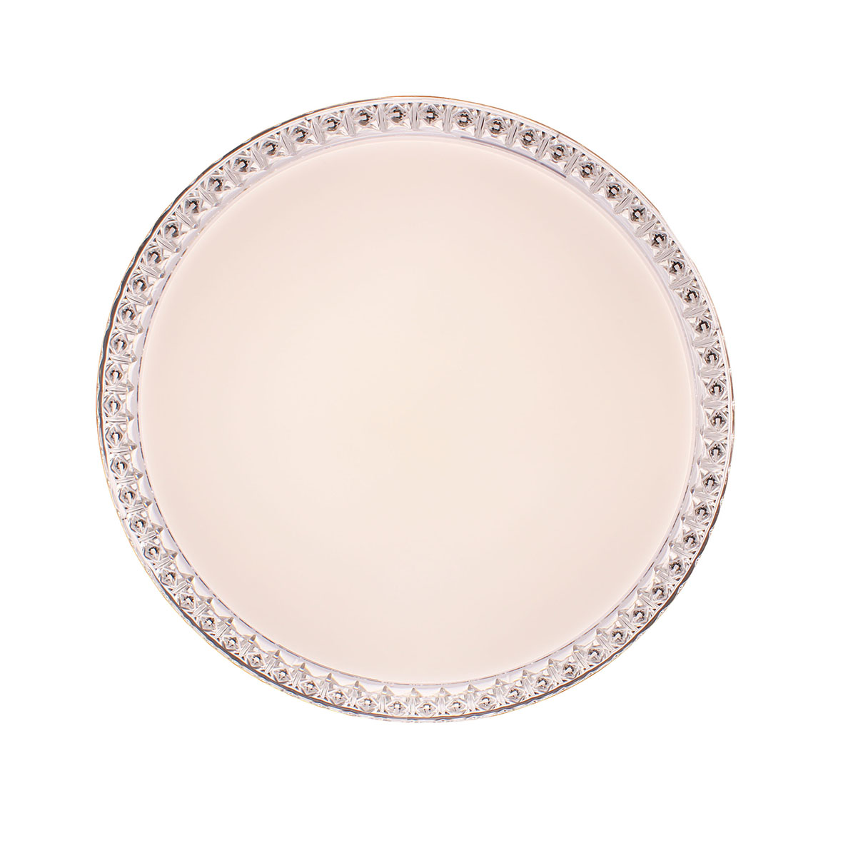 .Questa è una plafoniera a LED moderna ed elegante dal design circolare. Si distingue per il suo bordo perimetrale trasparente con una finitura a rilievo che simula il cristallo, creando un suggestivo effetto di luce scintillante quando la lampada è accesa.