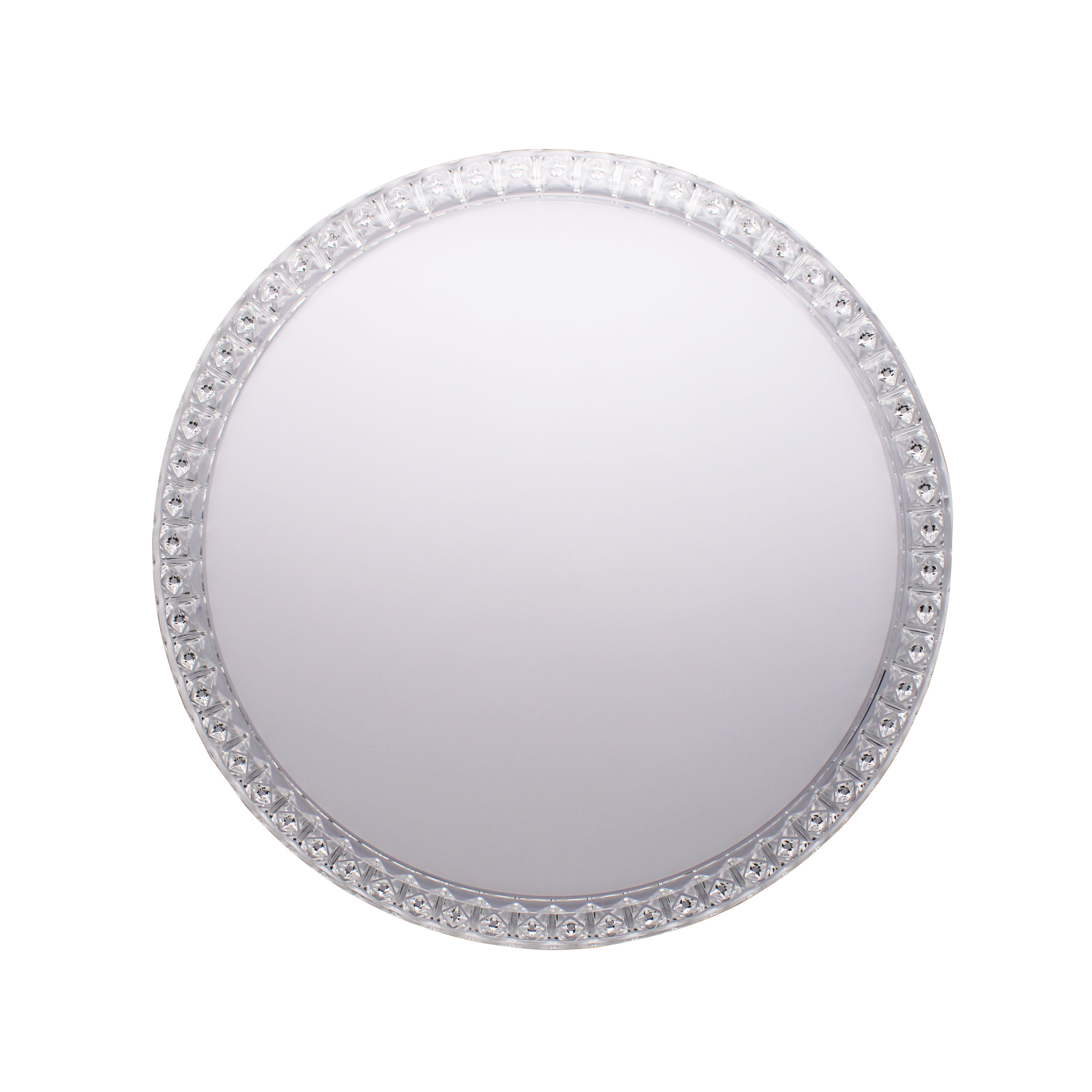 .Questa è una plafoniera a LED moderna ed elegante dal design circolare. Si distingue per il suo bordo perimetrale trasparente con una finitura a rilievo che simula il cristallo, creando un suggestivo effetto di luce scintillante quando la lampada è accesa.