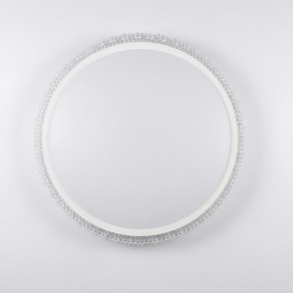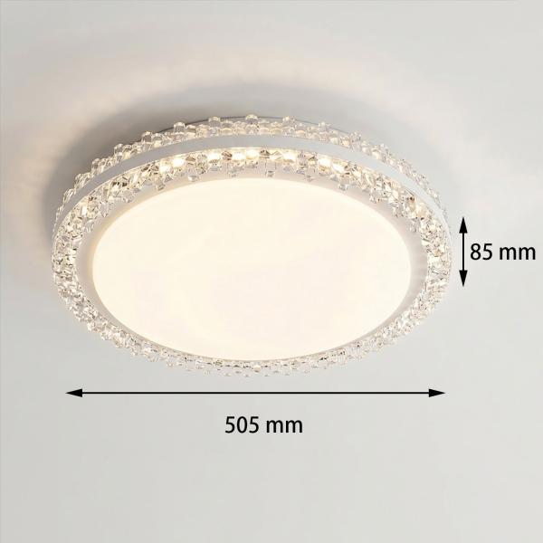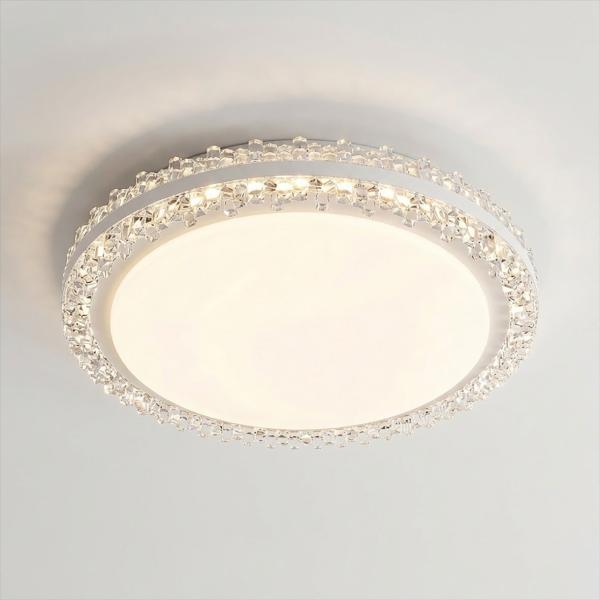 Design e Materiali: Il corpo lampada presenta una forma circolare essenziale, impreziosita da una bordatura in cristalli sfaccettati di alta qualità. La struttura metallica, con finitura cromata o bianca, riflette la luce enfatizzando la brillantezza dei dettagli in cristallo.