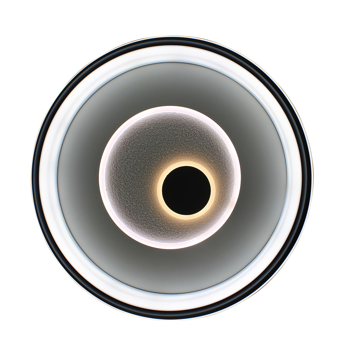 La fusione di diversi materiali e finiture (liscio, opaco e testurizzato) e di anelli di varie dimensioni crea un gioco di contrasti visivi che rendono la plafoniera un pezzo unico di arredamento. Ideale per ambienti che richiedono un'illuminazione elegante e non convenzionale, come studi, gallerie d'arte o moderni spazi abitativi. La tecnologia LED a basso consumo energetico garantisce prestazioni luminose eccellenti e una lunga durata.