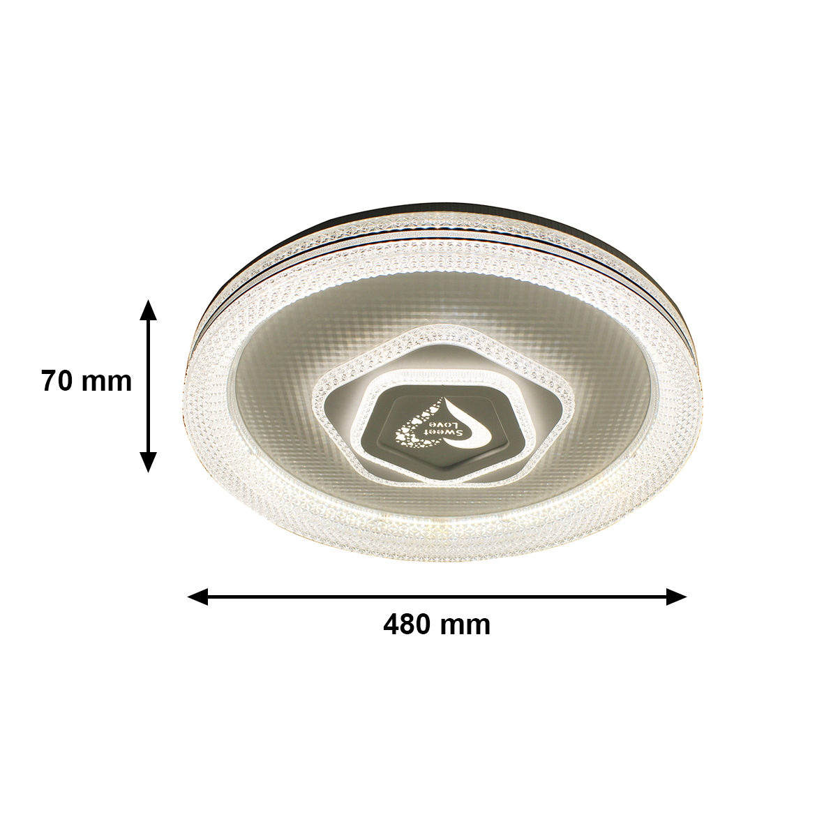 La lampada offre una luminosità di circa 6480 Lumens, è perfetta per illuminazione interna come ristoranti, locali, salotto, sala da pranzo o anche camera da letto. La plafoniera è realizzata in PVC, composta da gemme in acrilico al bordo e la scrittura “Sweet Love” nel centro del diffusore.