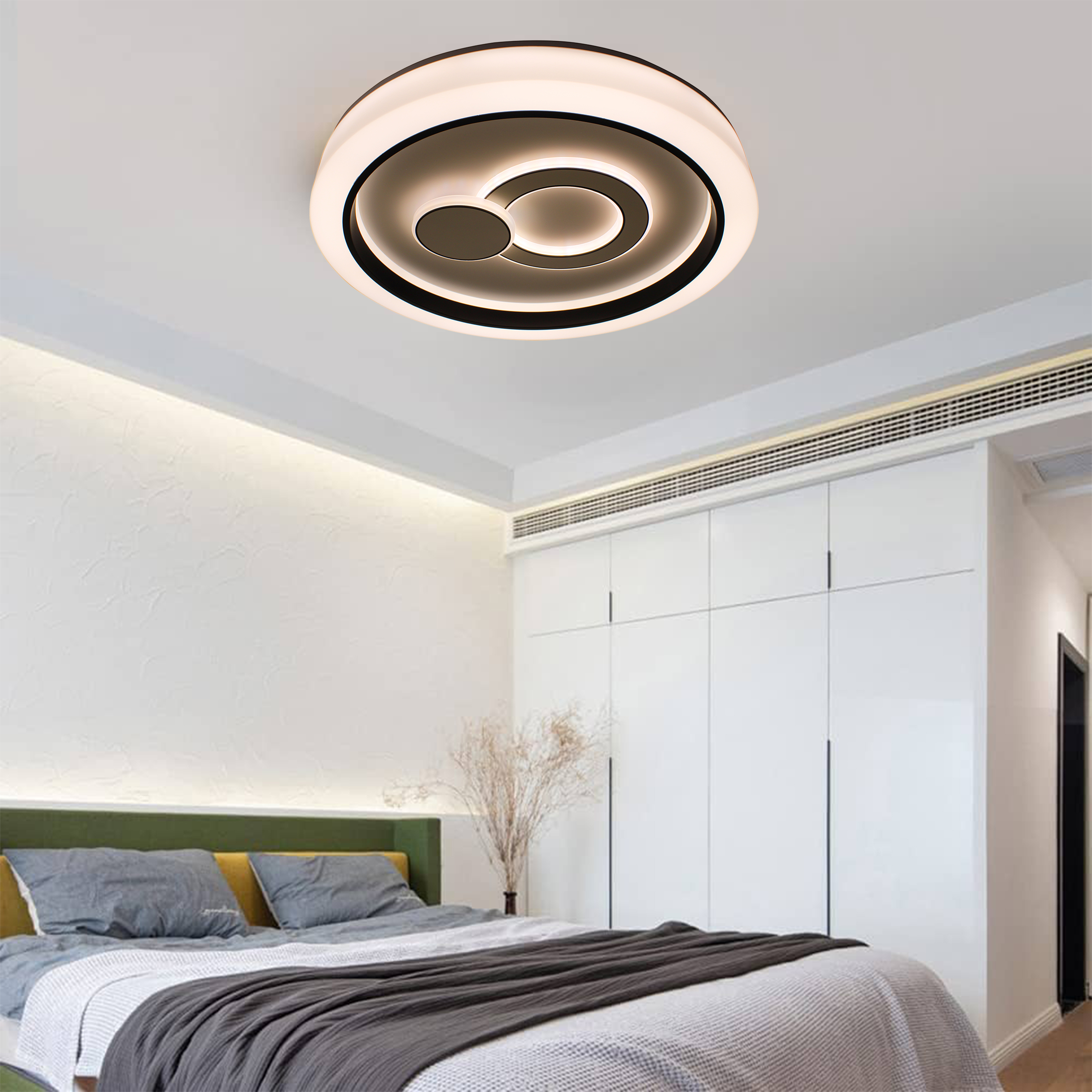 Plafoniera a soffitto Eclisse 72W caratterizzata da un design elegante e moderno, offre la possibilità di alternare 3 tonalità di luce nei due cerchi di led: calda 3000k, naturale 4200k e fredda 6400k. Ogni opzione è progettata ad adattarsi alle diverse esigenze e atmosfere, garantendo sempre il massimo comfort visivo.