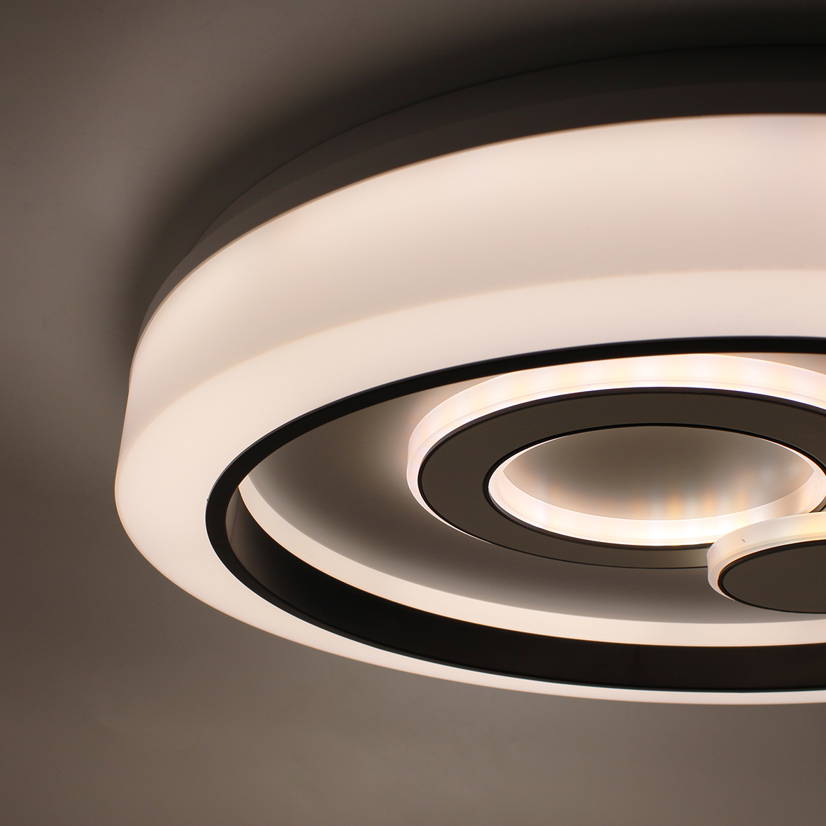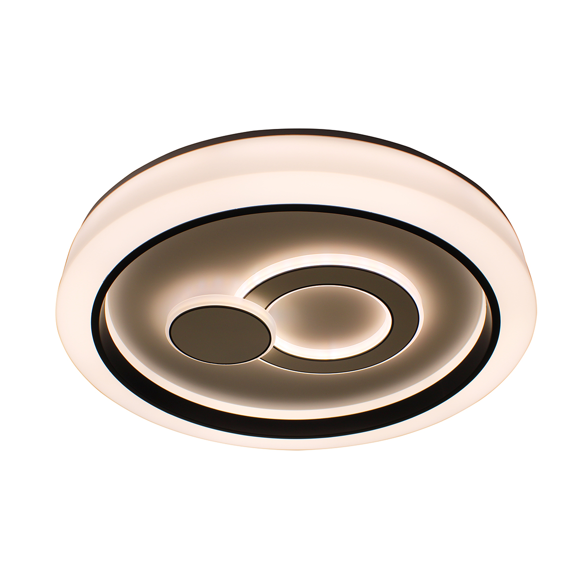 Plafoniera a soffitto Eclisse 72W caratterizzata da un design elegante e moderno, offre la possibilità di alternare 3 tonalità di luce nei due cerchi di led: calda 3000k, naturale 4200k e fredda 6400k. Ogni opzione è progettata ad adattarsi alle diverse esigenze e atmosfere, garantendo sempre il massimo comfort visivo.
