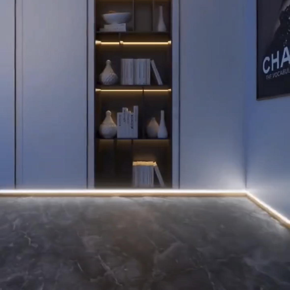Il battiscopa in alluminio nero opaco di alta qualità per striscia led mostra un’illuminazione decorativa indiretta, l’ideale per la decorazione di piastrelle in ceramica, pavimenti o pareti  in pietra o legno.